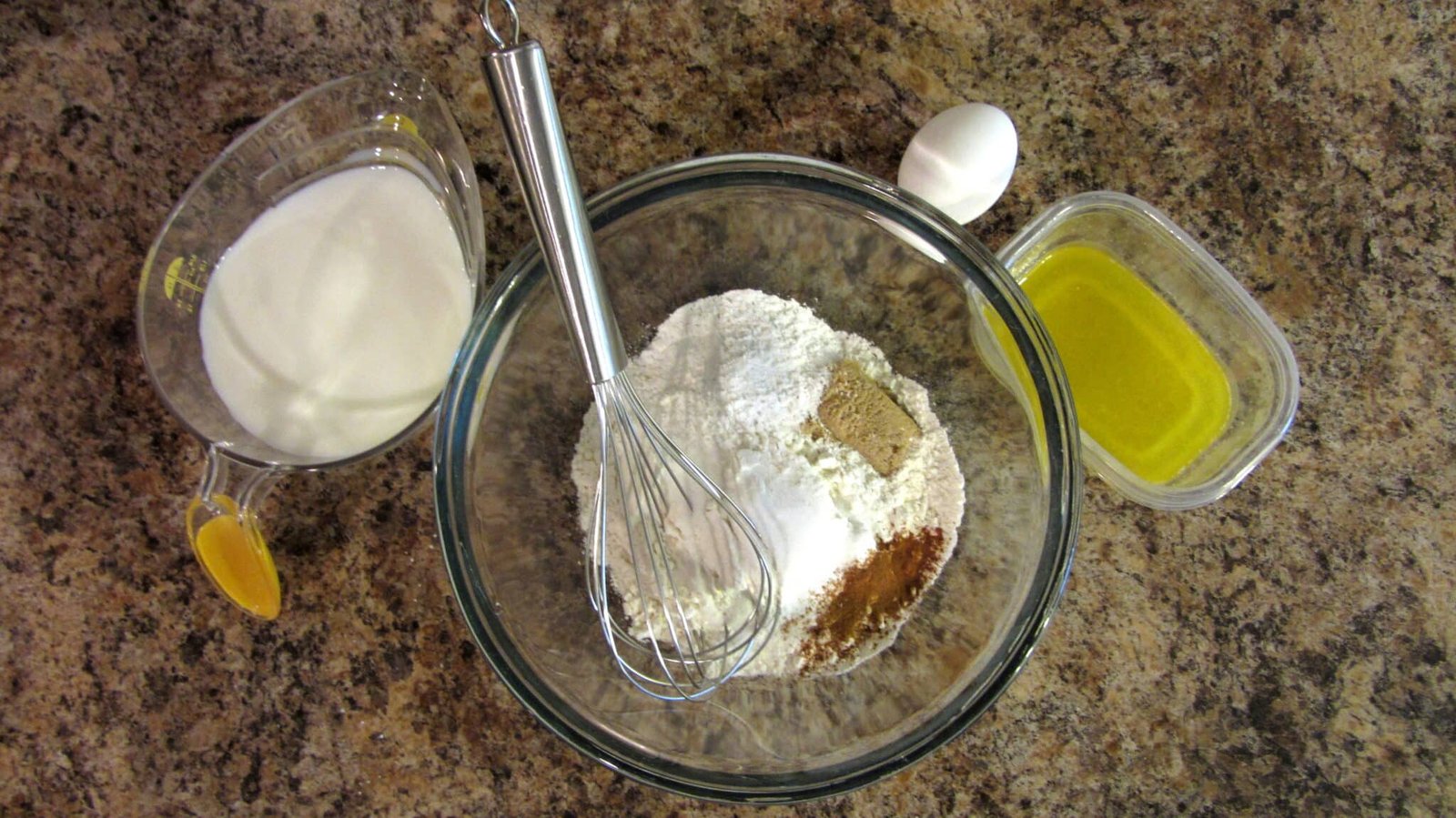- Get a large bowl, put all of the dry ingredients in and make a well. And in that well, pour all of the wet ingredients, and then mix until it’s nice and smooth.