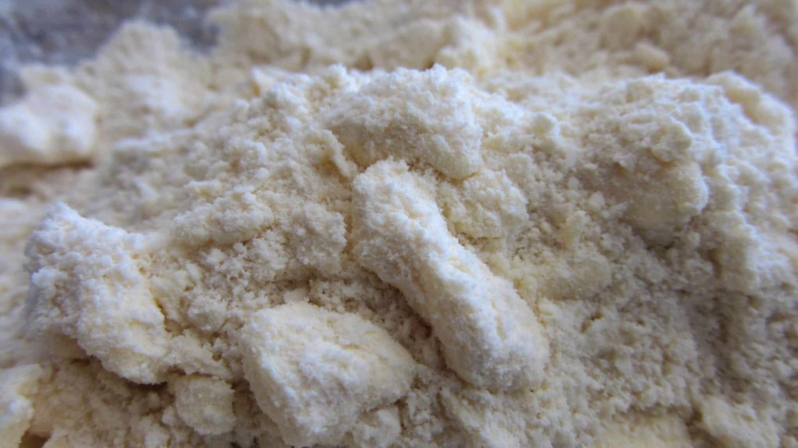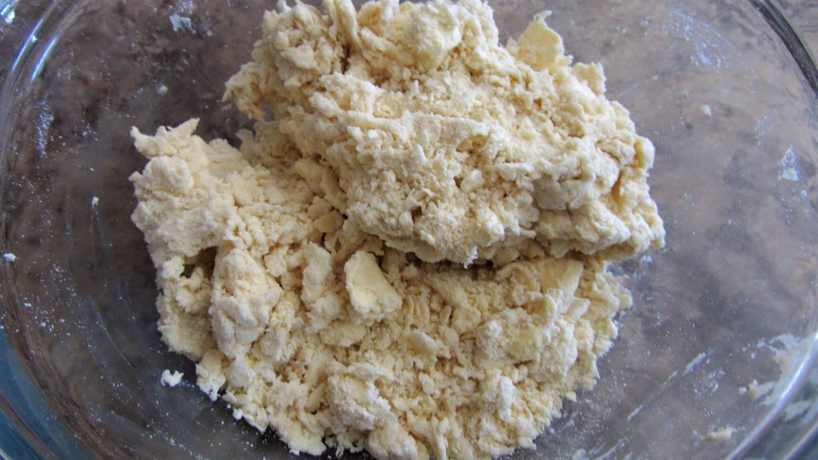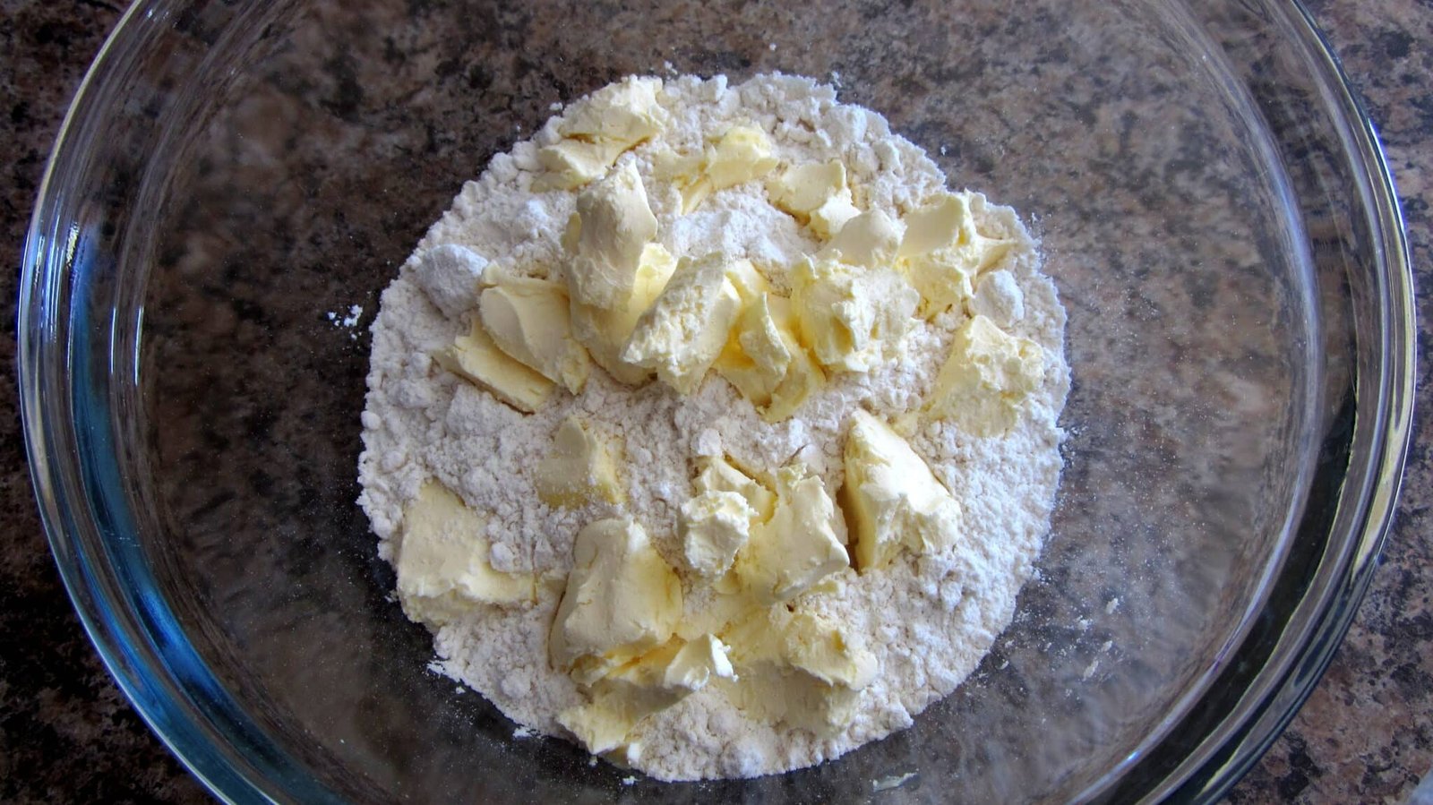 - In a bowl, combine the Flour and Salt. Spread out the diced Butter and work it in to the Flour until you get something that looks like bread crumbs. If you squeeze some in your hand, it should hold together and not fall apart.