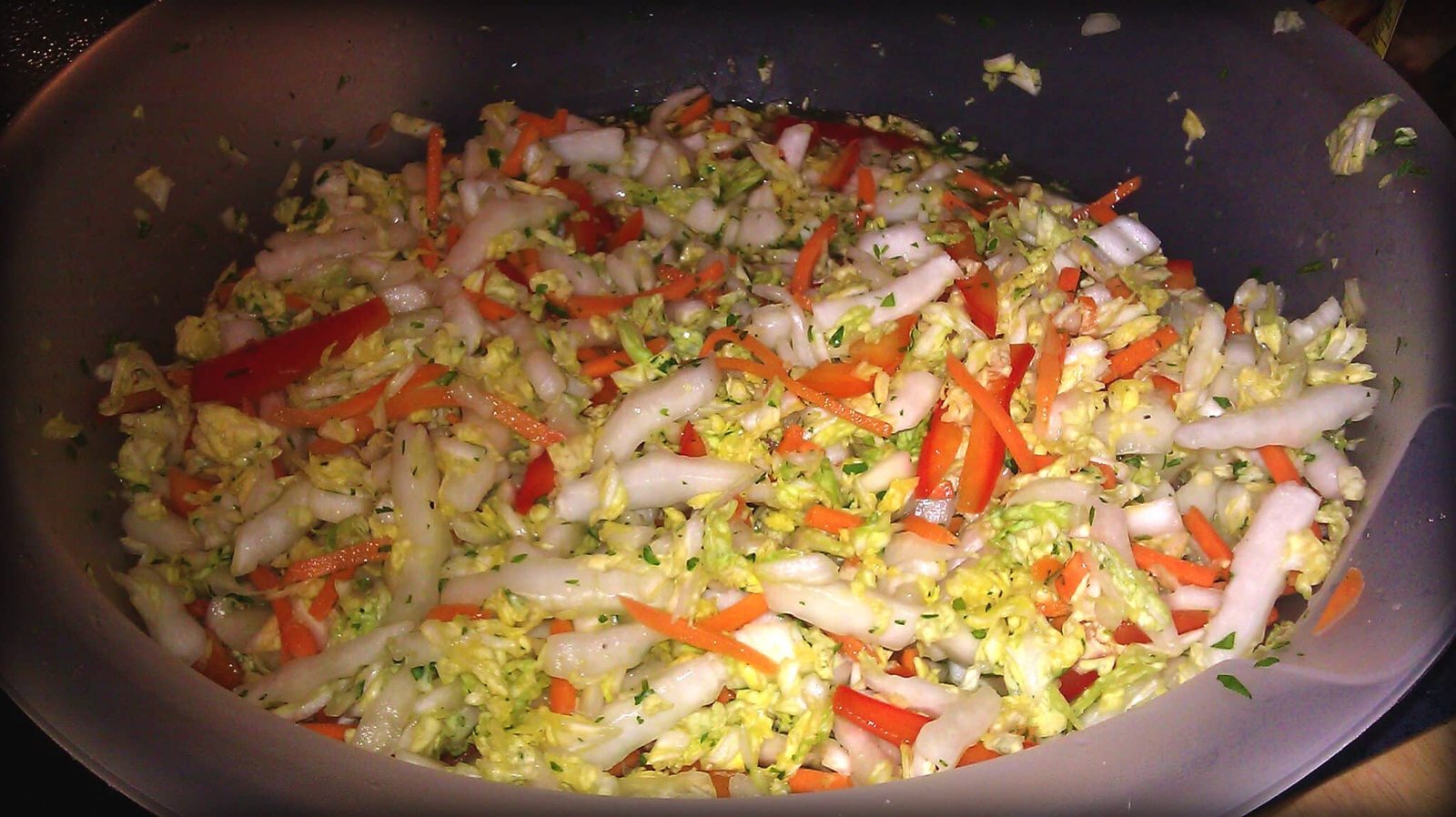 - Once it’s clean set it flat on your board and cut it in half length wise again, then start chopping it from the top. You’re looking for a nice small thickness to the shreds, not something super thin. Think coleslaw. Once the entire cabbage is shredded, cut the Red Pepper julienne (thin strips) to match the cabbage. Once the pepper is sliced, you can open up your bag of shredded carrots and throw a cup (or same amount as the pepper) into the bowl. …What? You think I’m going to waste time shredding a carrot? Do you know me?? Next, chop up your Cilantro and/or Mint and throw it in with everything else.