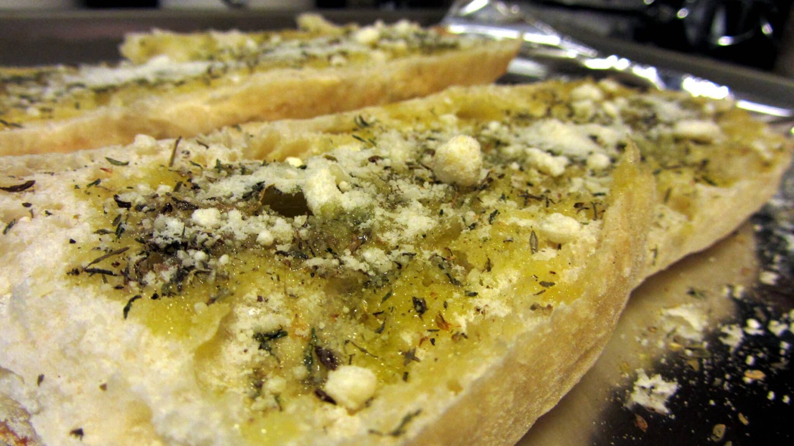- Now take the garlic oil and give it a nice drizzle on the bread. Don’t put too much though or you’ll have an oily, greasy mess that no one would want to take a second bite into. Next, depending on how salty your oil is, add the salt and pepper, and then the herbs, then the cheese. You want to sprinkle everything evenly around so it’s all covered. You can grate some fresh Parmesan on there instead of the already grated stuff you buy, either way you will win.