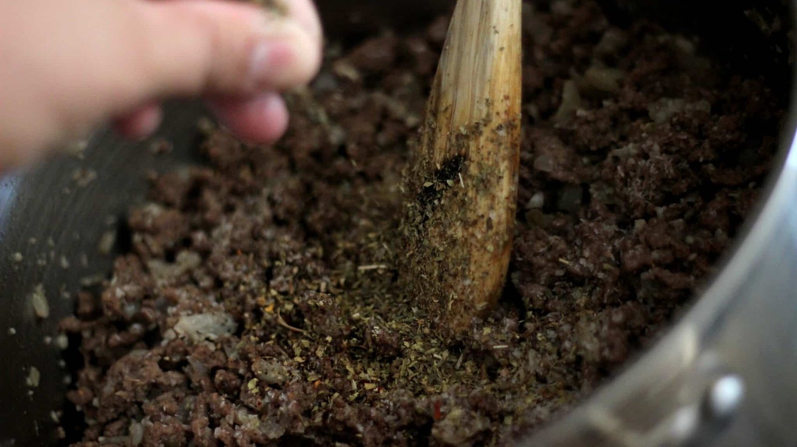 - When done, add the ground meat, salt, pepper, and herbs and spices. Then cook until brown, draining if you have to.