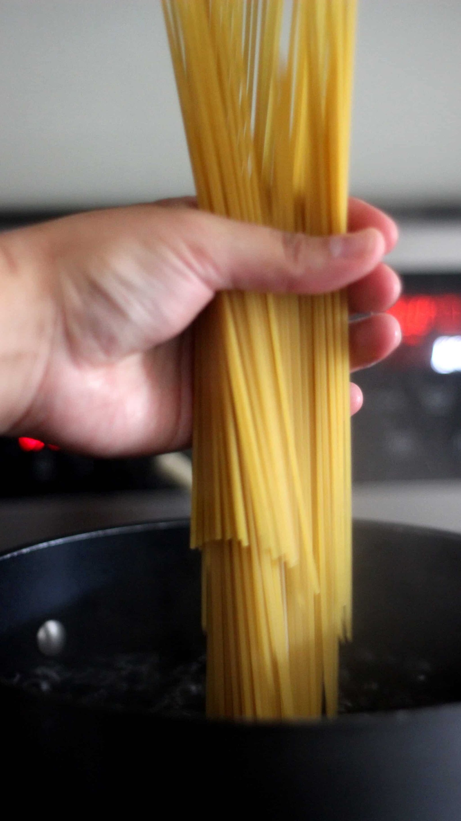- Fill up your big pot with water. Not to the tippy top, psycho. Leave about 3 – 3 1/2 inches at the top. Put it on the burner and turn the heat on high. I usually salt my water after it comes to a boil because salted water takes longer to boil and I don’t have the…