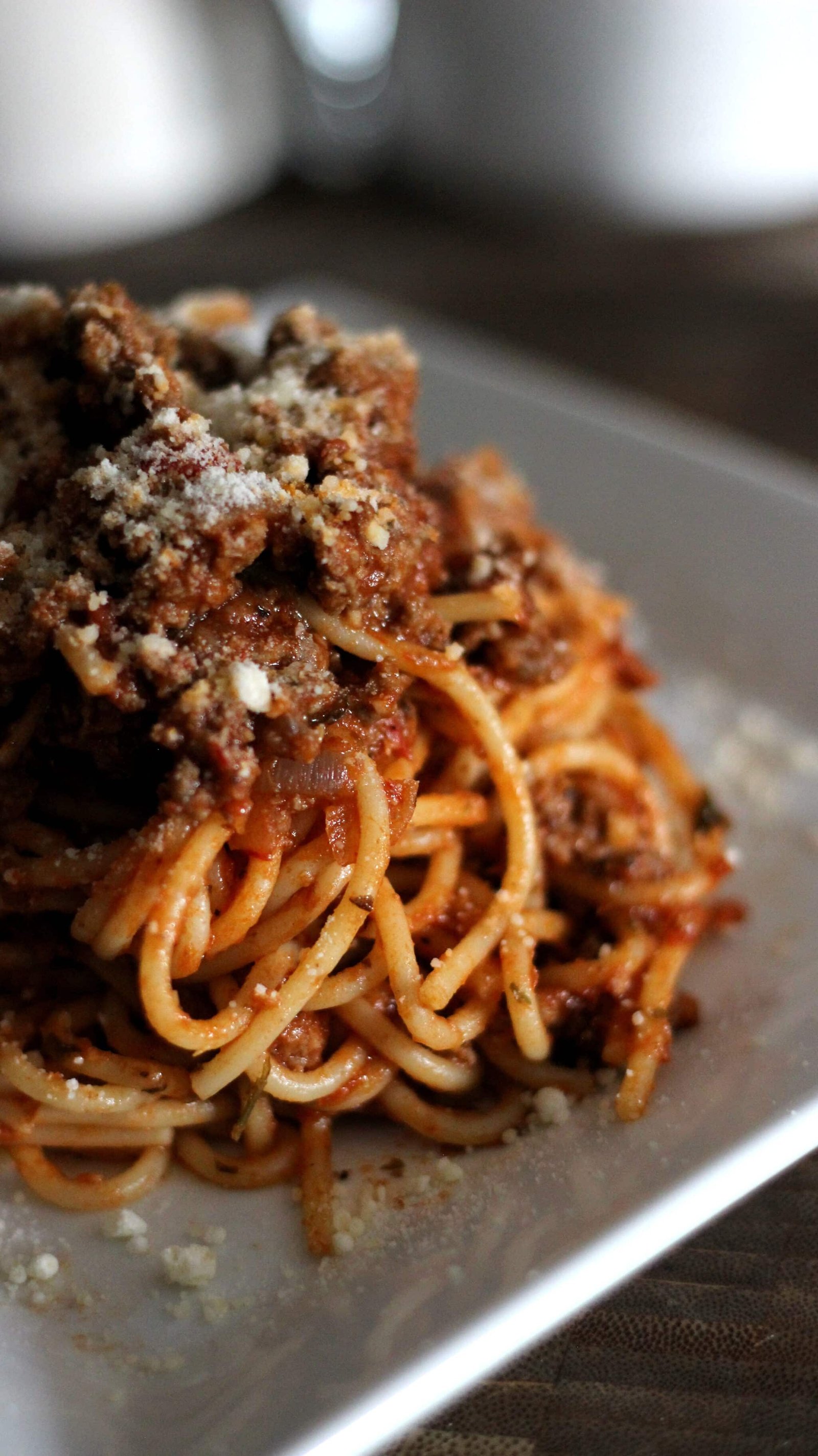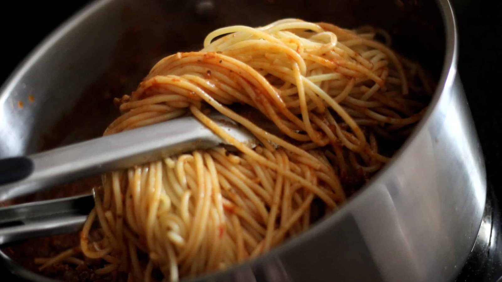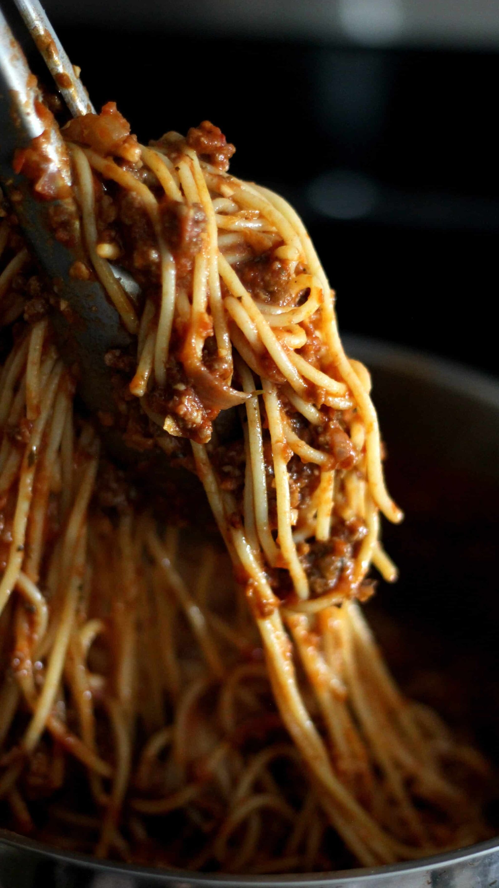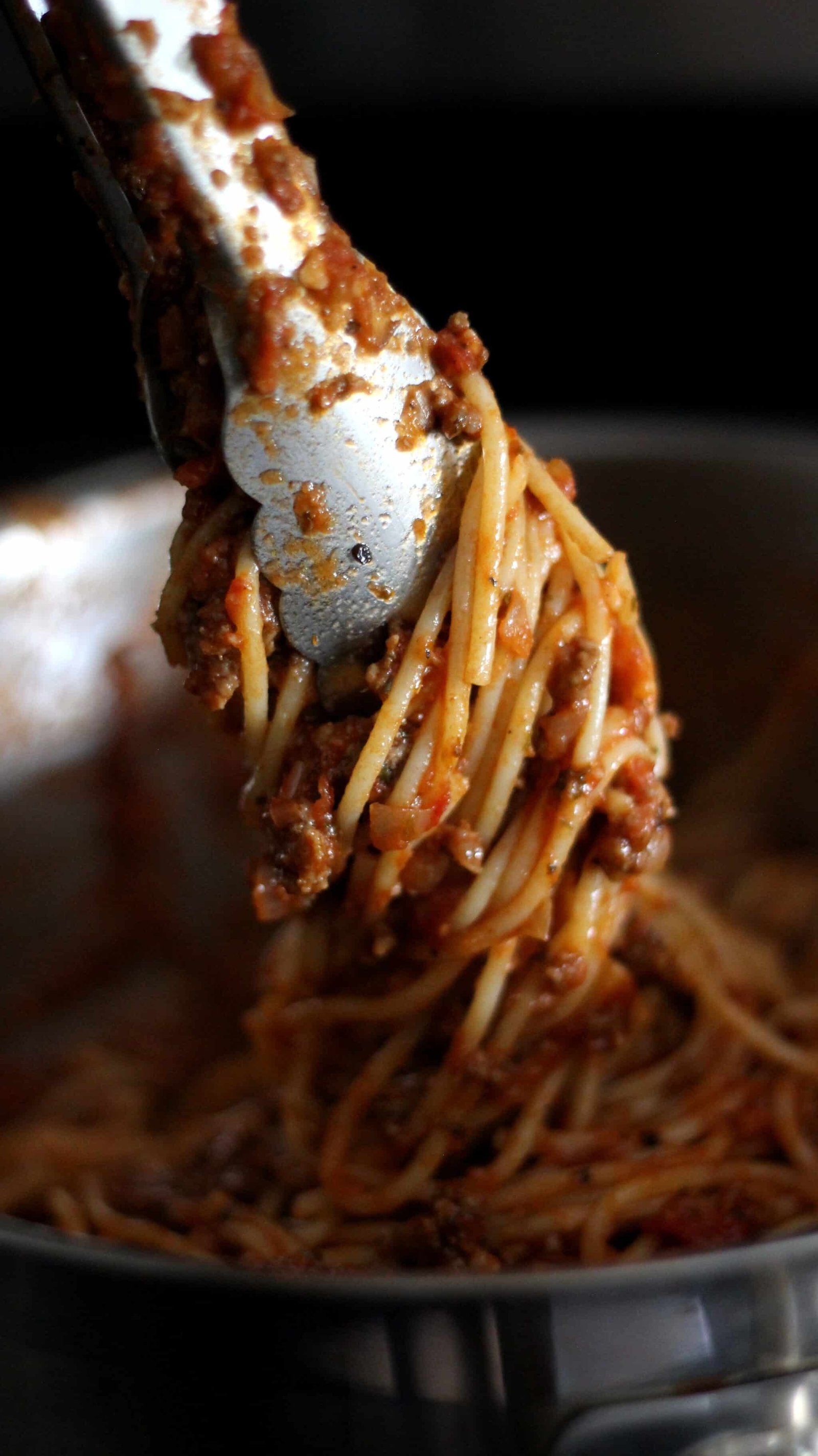 A little technique I picked up for presentation – instead of just plopping the pasta on a plate and calling it spaghetti, give it a twirl with a pair of tongs.