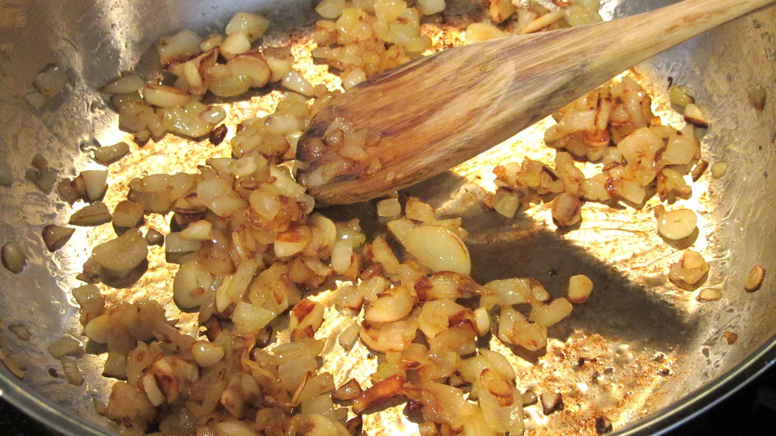 - After you get your water going, get yourself your favorite big pan or pot and put it on med-high heat with about 2 tablespoons of olive oil. After you use whatever garlic oil you’re going to use for your garlic bread, feel free to use that oil here for some extra love. Put the chopped garlic, onions and red pepper flakes in and cook until the onions and garlic are sweet and caramelized. This is going to give that hint of sweetness that every red sauce needs.