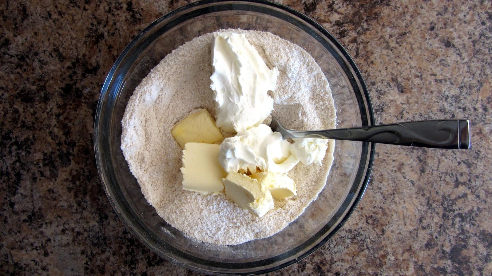 - You’re going to need two bowls. In the first bowl, add all the dry ingredients and mix them. You can use your toes to mix them, I don’t care. I do care that you use a fork for the next part. Add the cold butter and cold cream cheese to the dry ingredients and use your fork to incorporate and “cut in” until you reach a crumbly state. Please don’t overmix and destroy the world.