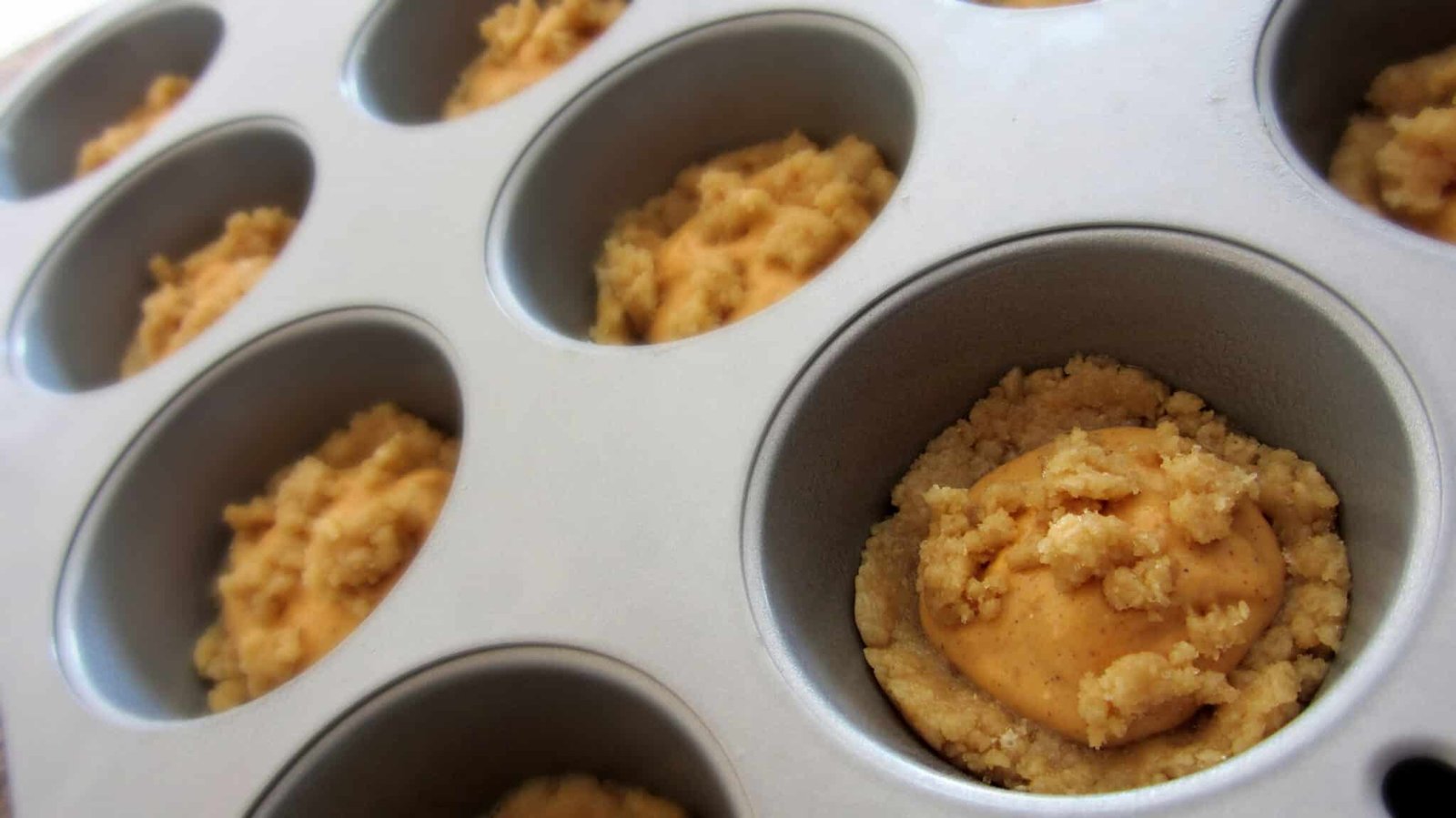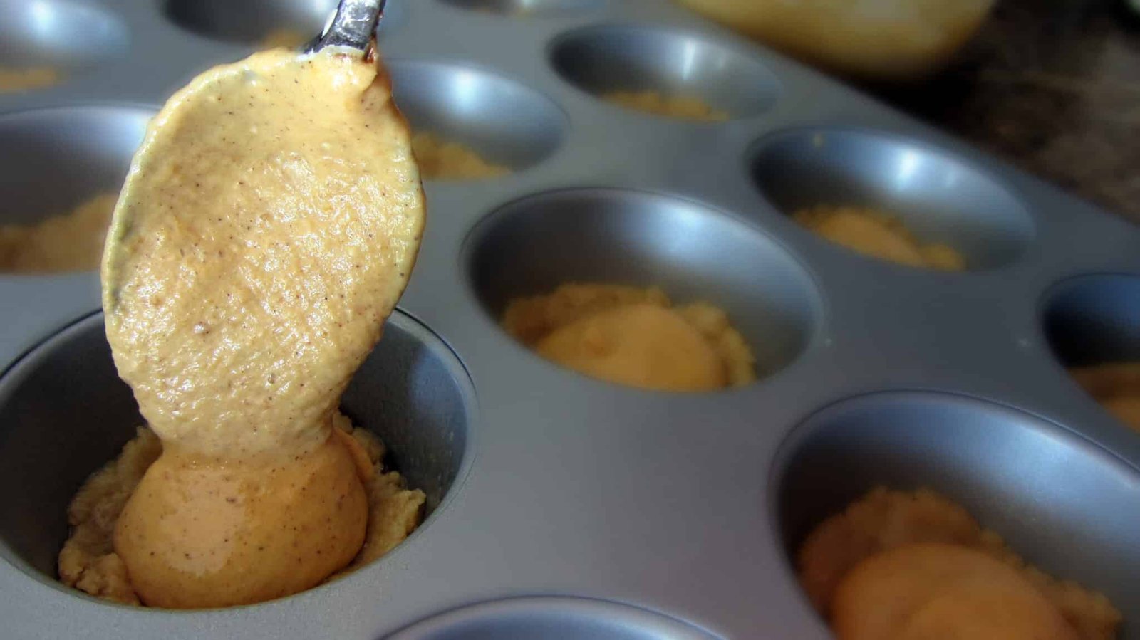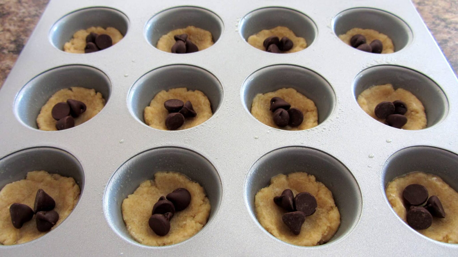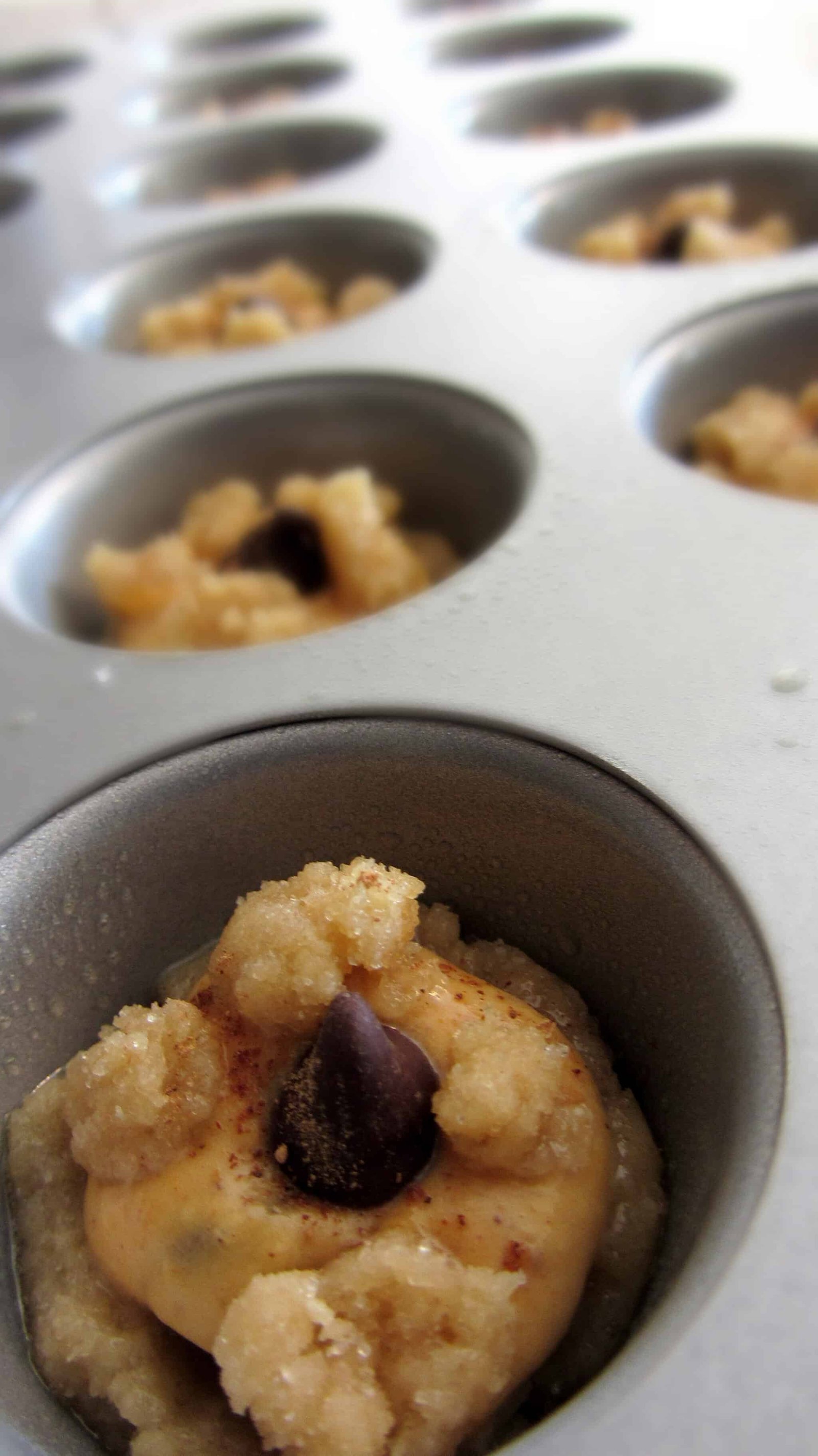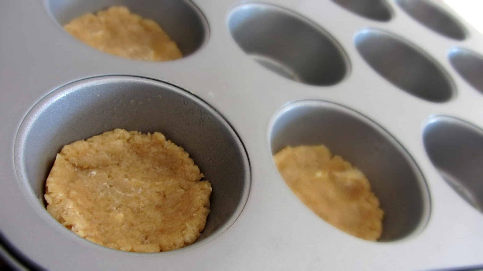 - Take your regular sized muffin pan and spray it with nonstick cooking spray. Work one pan at a time that way you don’t grease up more than what you need. Grab about a tablespoon of the cookie mixture and press it down into the bottom of the muffin cups.