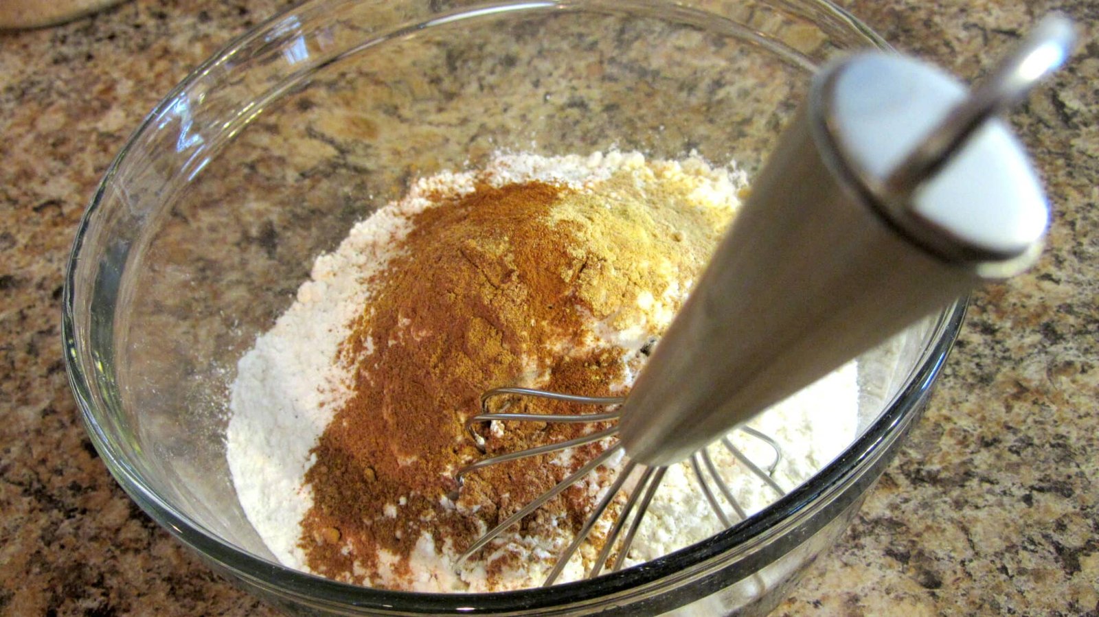 - For the batter, take the flour, baking powder, salt, and spices and mix them together in one bowl. Take another bowl and add the oil, brown sugar, egg, extract, pumpkin puree and milk, and whisk that till it’s smooth. Once it’s smooth, add the dry mix to the wet mix and whisk till it’s combined and happy.