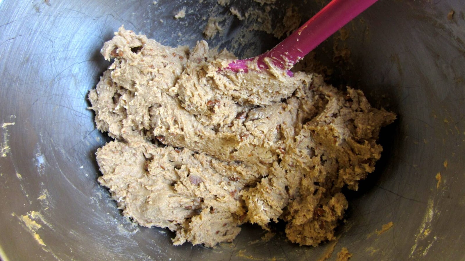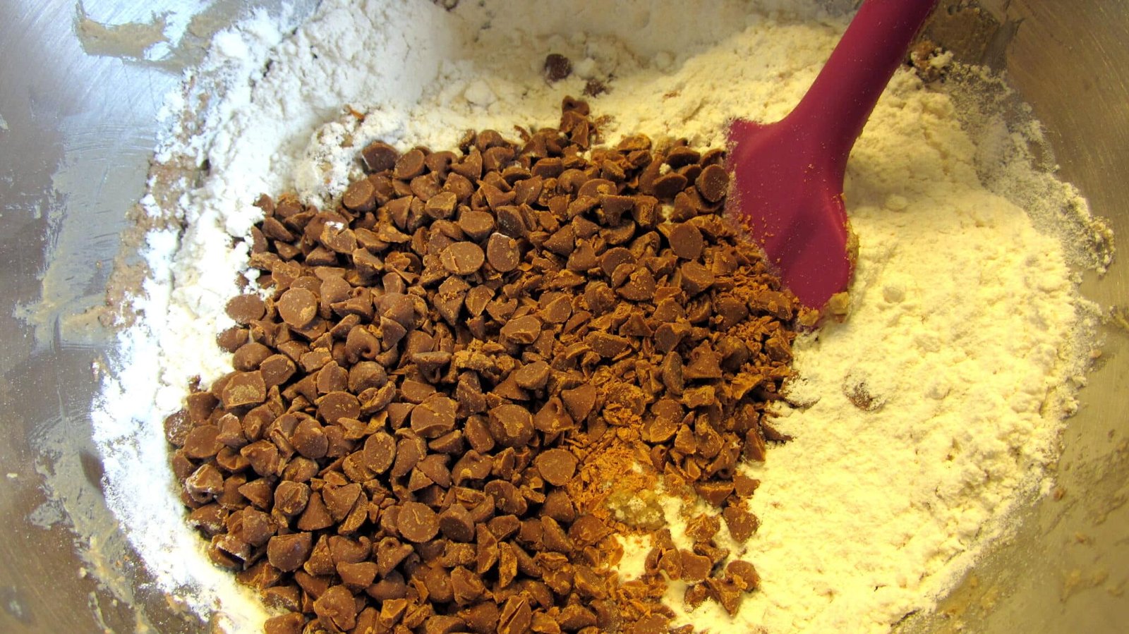- Once it’s combined, take out the bowl and with a spatula, fold in the flour and the cinnamon chips.