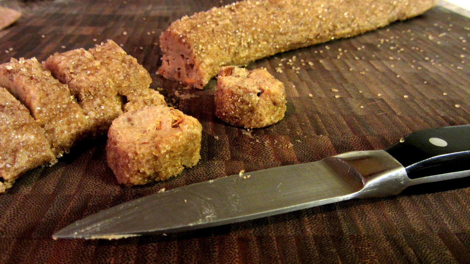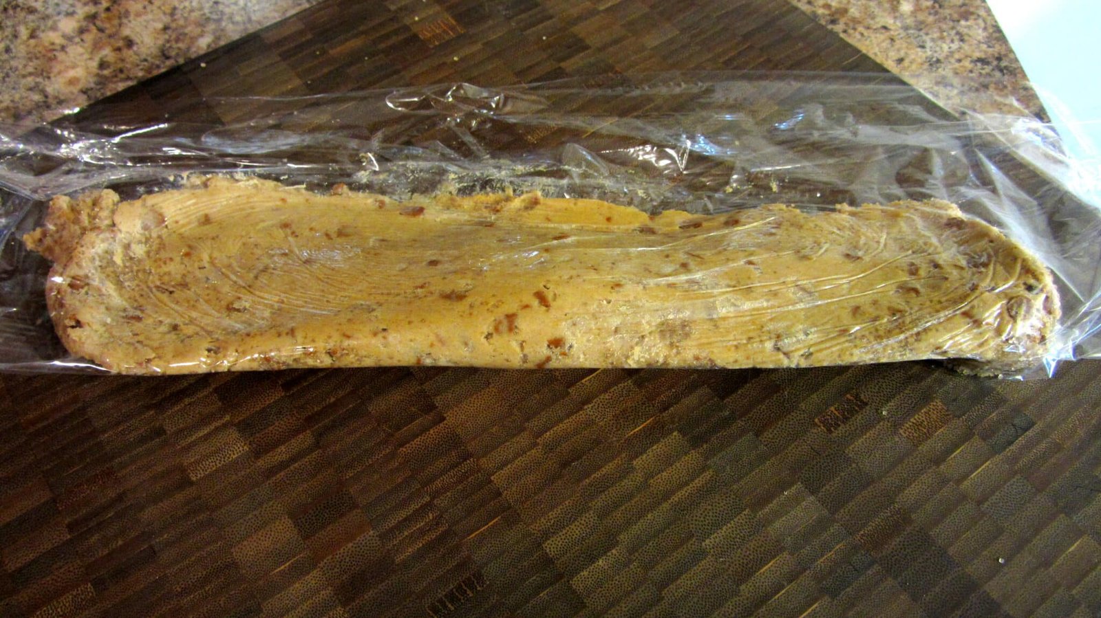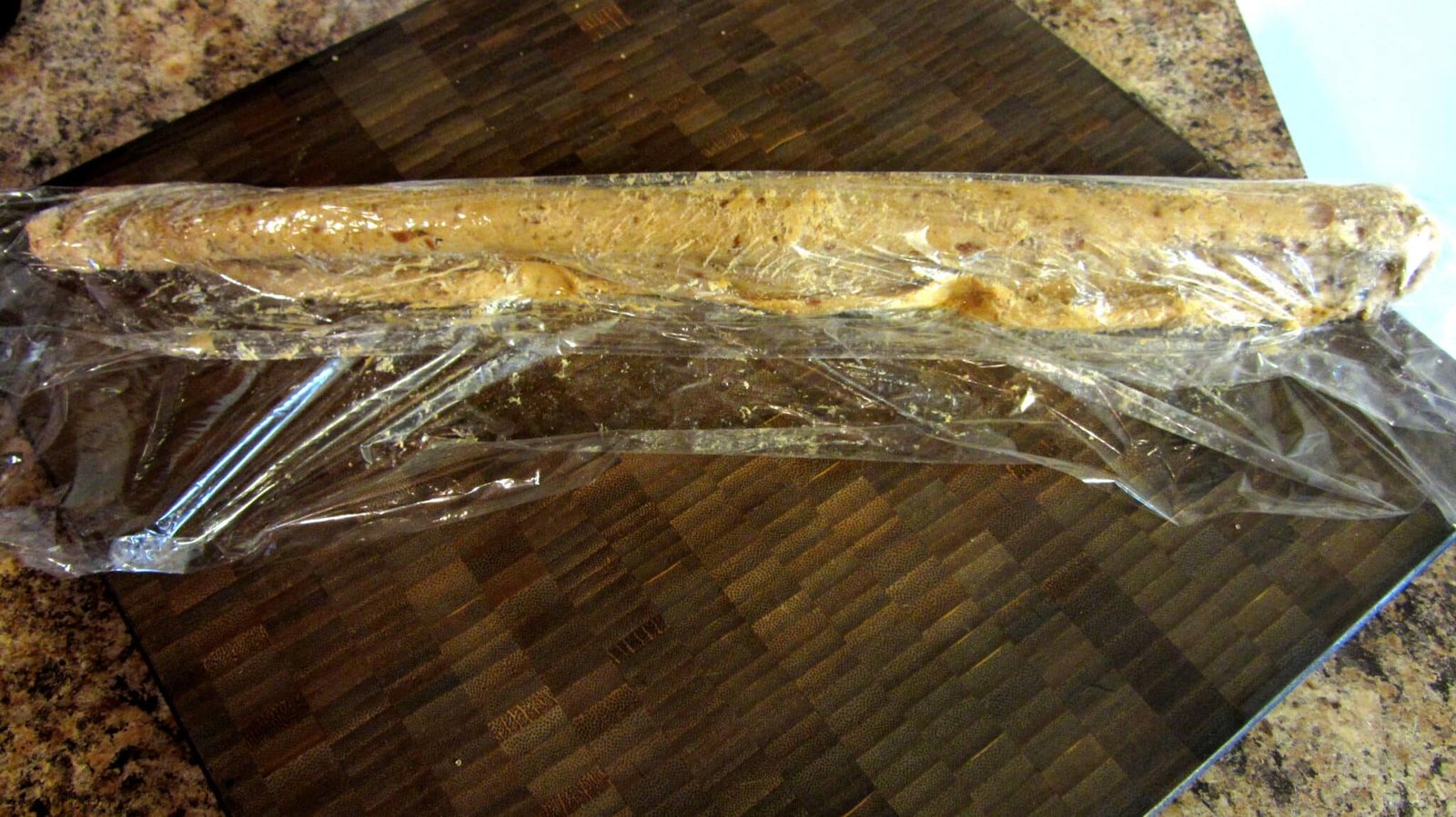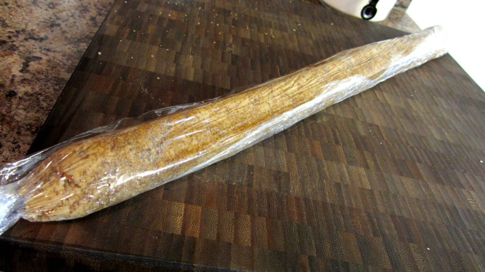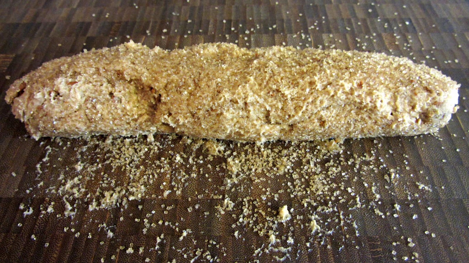 - First, if you have a work surface you like for such things, sprinkle some of the turbinado sugar on it and plop half of the dough on to the sugar. Work it into a log shape and then roll it till it’s about 1/2 inch thick. Take the rolled dough and transfer it to a long piece of plastic wrap and roll it up and close off the sides.