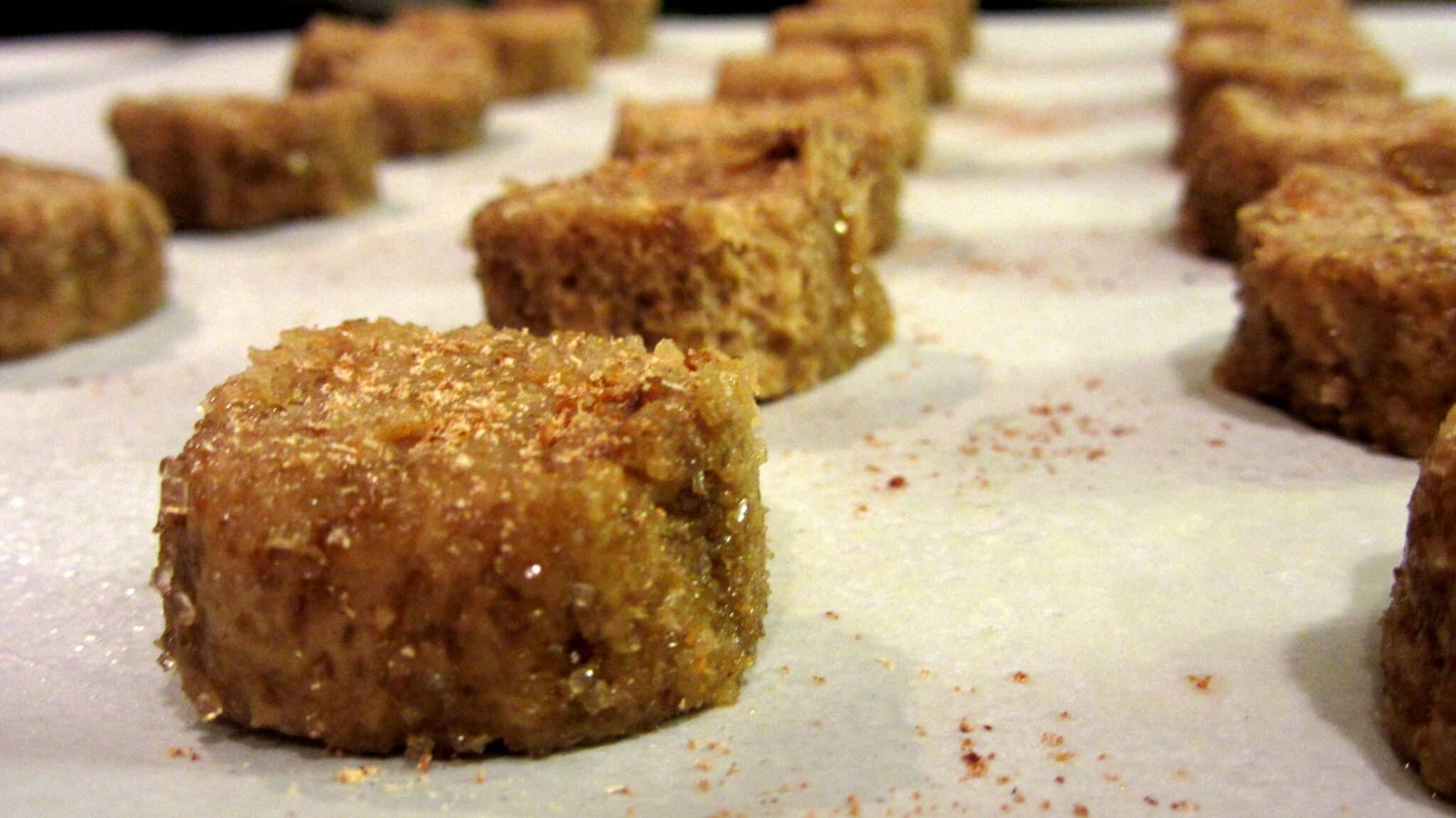 - Once the time has passed, turn on your oven to 350. Take the dough and roll it in a little more turbinado sugar. Get a nice coating on there and then cut the dough about a 1/4 of an inch thick. Place the coins about an inch apart on a parchment lined cookie tray that was sprayed with cooking spray. Something I like to do at this point is grate some more nutmeg on the top of the cookies, but I’m spicy like that. Put them in the oven for 16 – 20 minutes, until the edges get a little color and the center is a little firm.