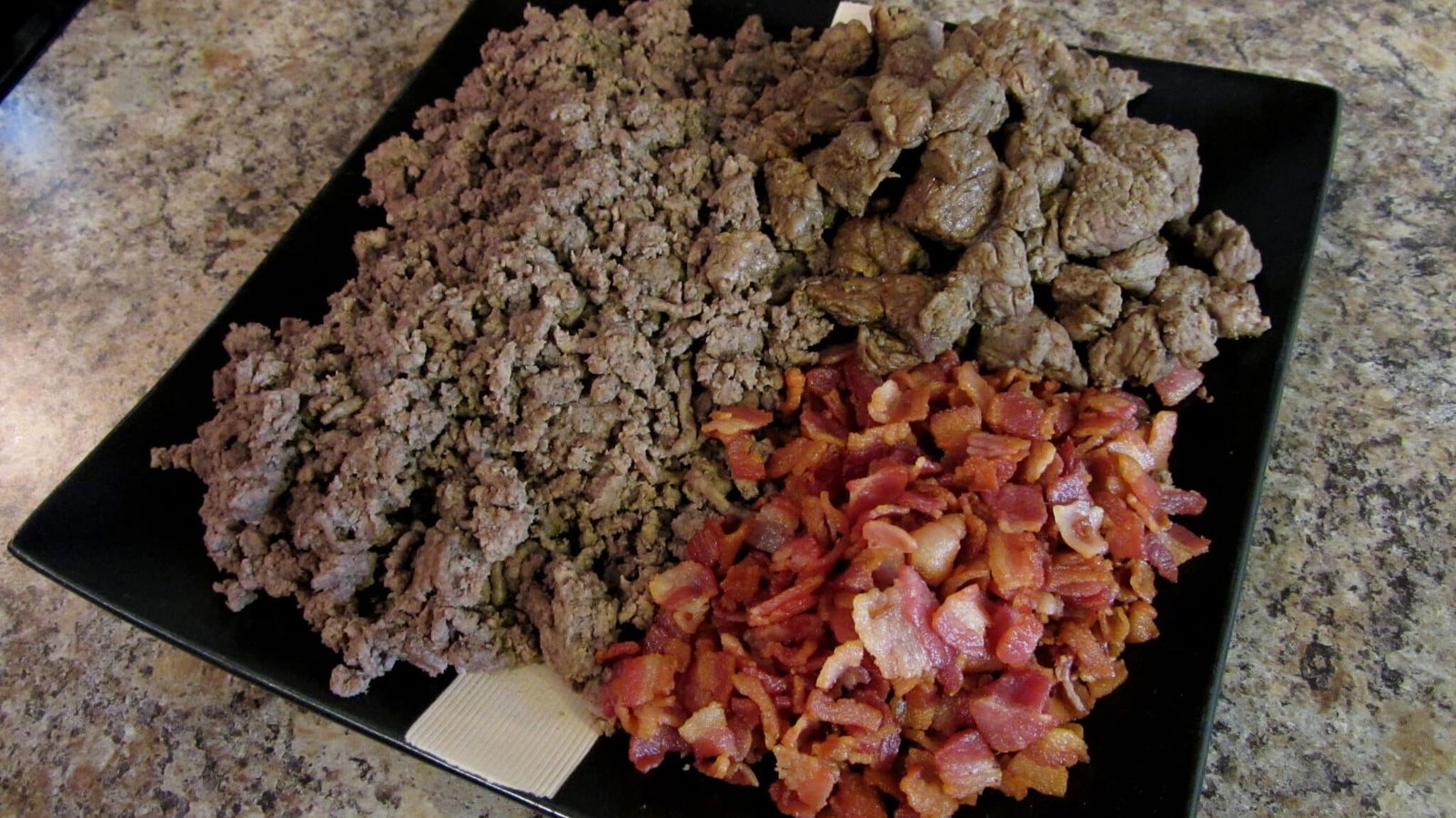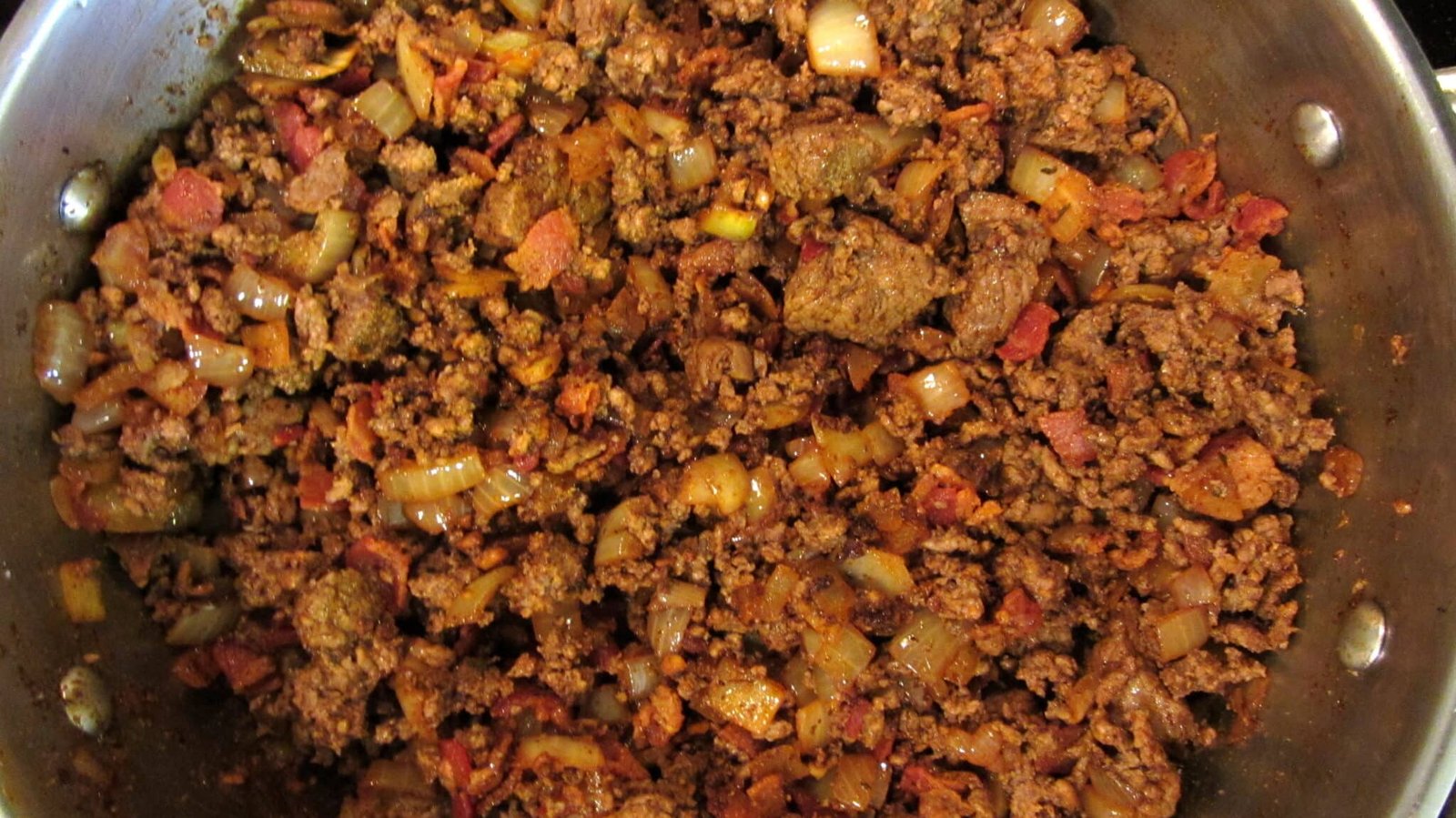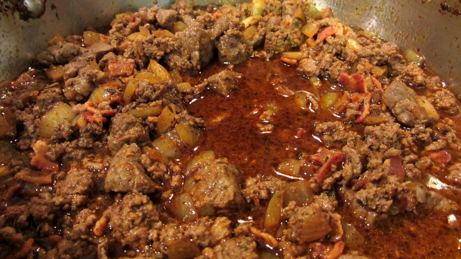 - Now, add more of the bacon goodness, and cook the ground beef. Same thing with the liquid, just drain it. Once it’s done and you don’t see anymore red, remove it from the pot and set it aside. You should now have a huge bowl or plate filled with glorious meat.