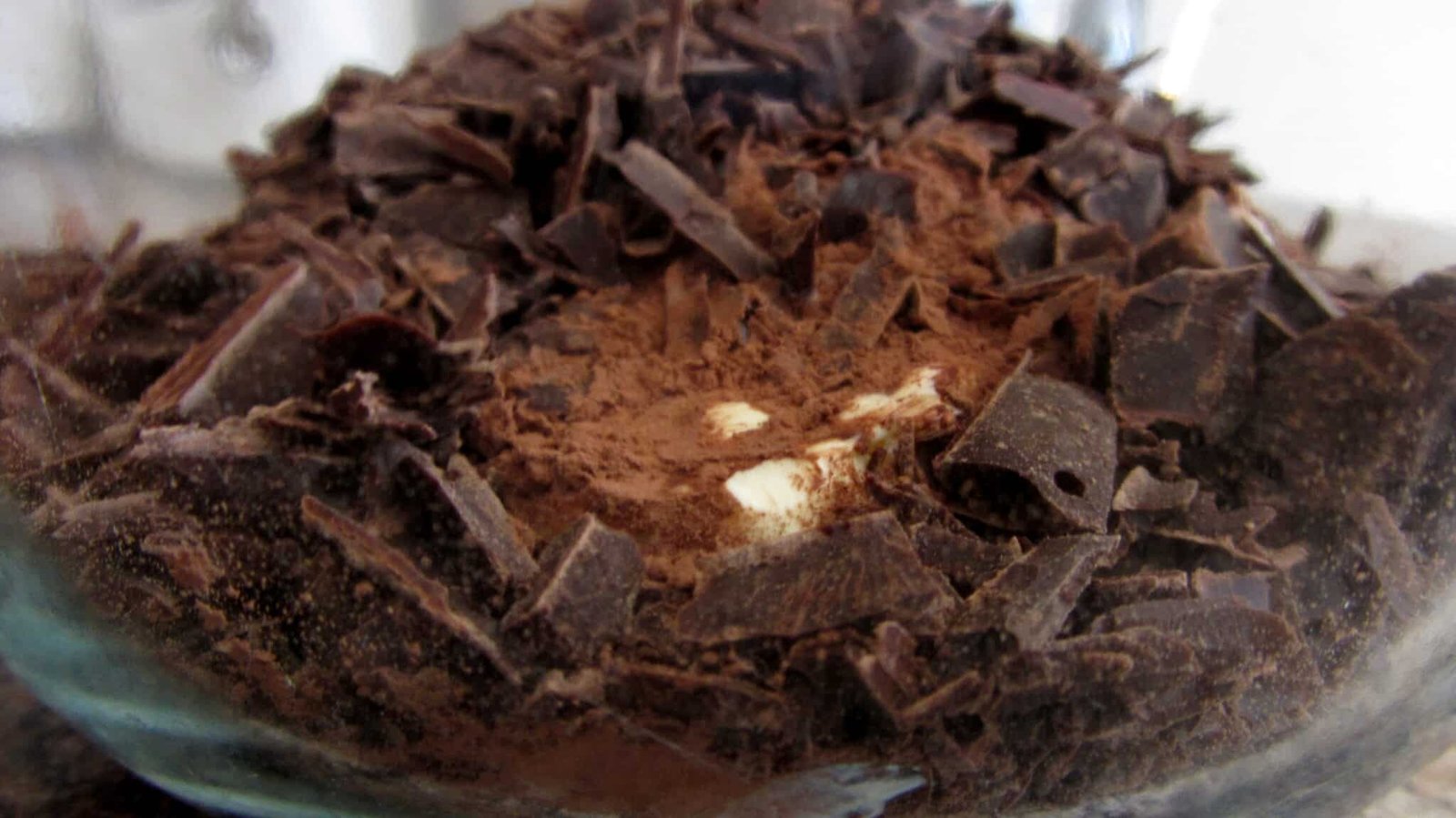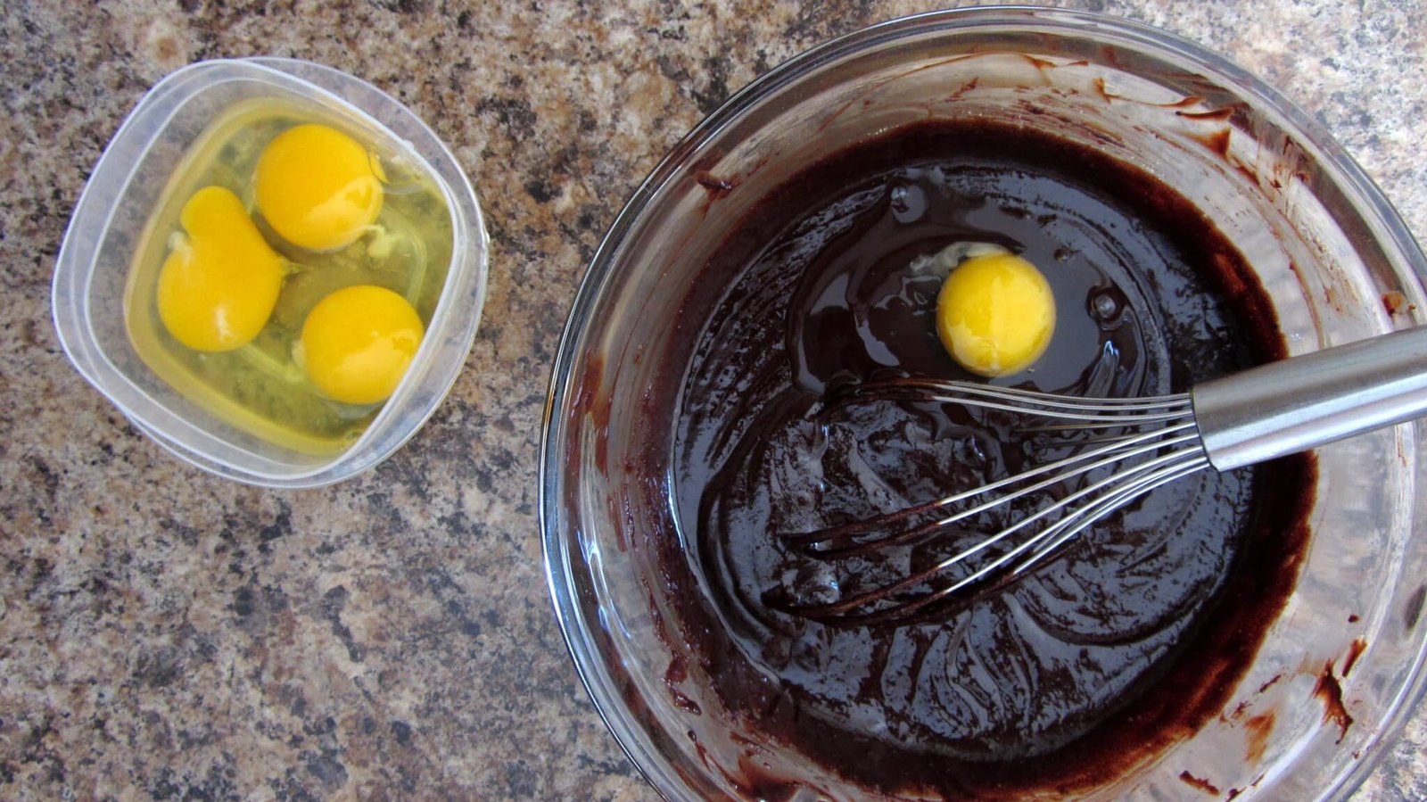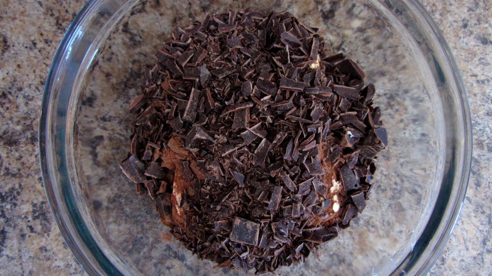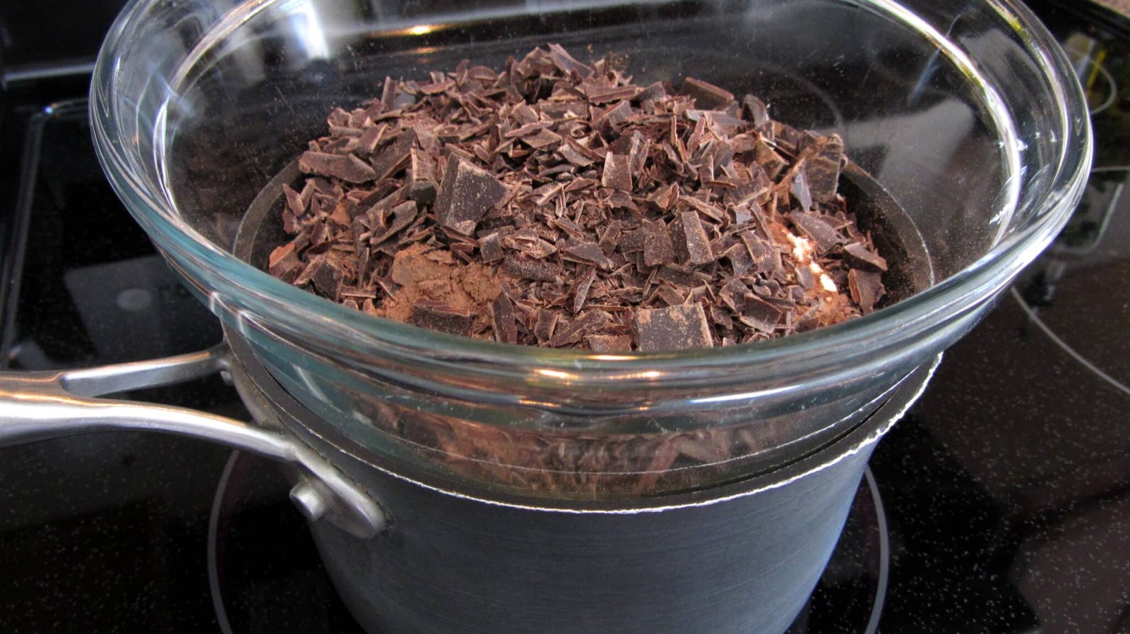 - Whichever way you go, put the chopped chocolate, butter and cocoa powder in a bowl and melt it until it’s smooth. Take it off the heat and let it cool for a few minutes until you can touch it and it doesn’t feel hot. Warm is ok. We’re going to add eggs to this, and I don’t think you want chocolate scrambled eggs.