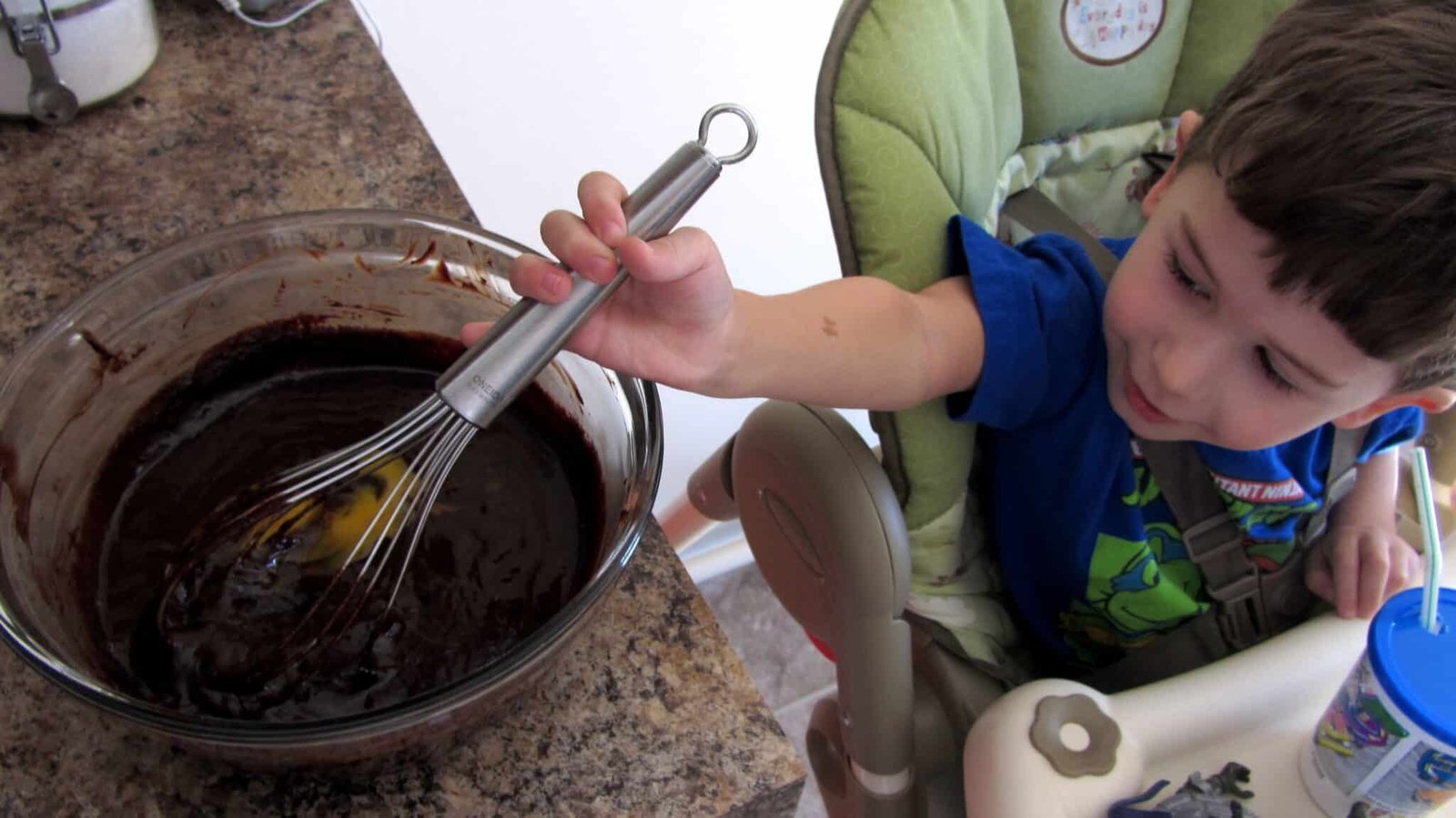 Not because it’s flour and you can make a mess. I really don’t care if you make a mess or not, I’m not going to clean it up. No, stir slowly because you don’t want to over mix it. This is the reason why you always make brownies by hand and never with a stand or hand mixer. If you over mix the flour, you’ll create gluten. And gluten is not something you want in your brownies. They’ll come out cake-like and will be dry and flat as oppose to crumbly and soft.