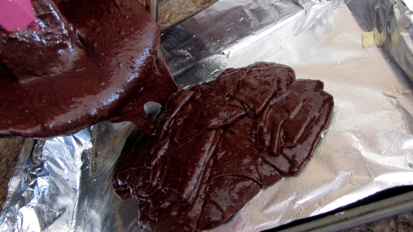 - Pour half, yes, half of the brownie batter into the prepared pan. Smooth it out, do whatever you have to do. It’ll look like it’s too thin of a layer, and you’ll question yourself up and down, but trust me, it’s fine. Just make sure it’s evenly spread out. Put it in the oven for 15 minutes.