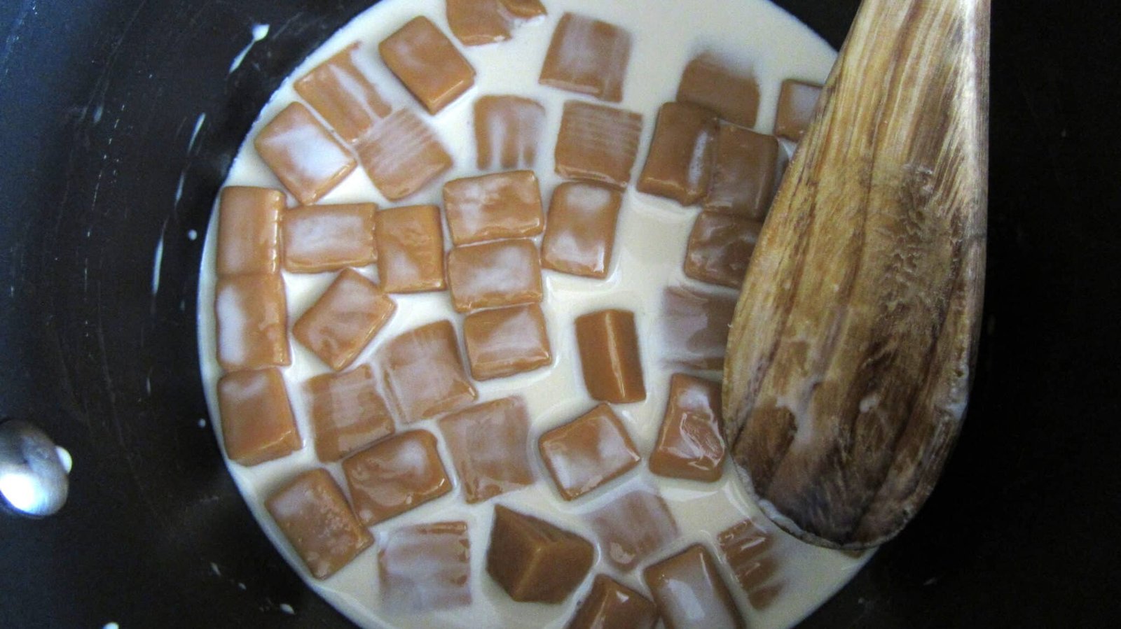 - Put them into a sauce pan with the heavy cream and put them on medium heat. Stir occasionally until you have a nice smooth caramel sauce.
