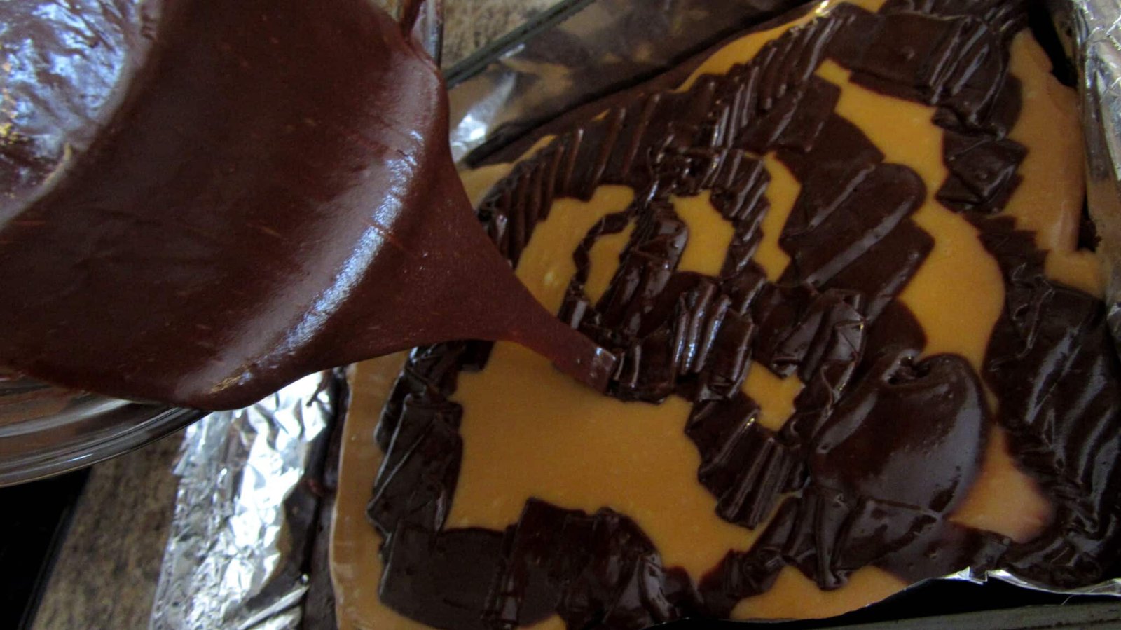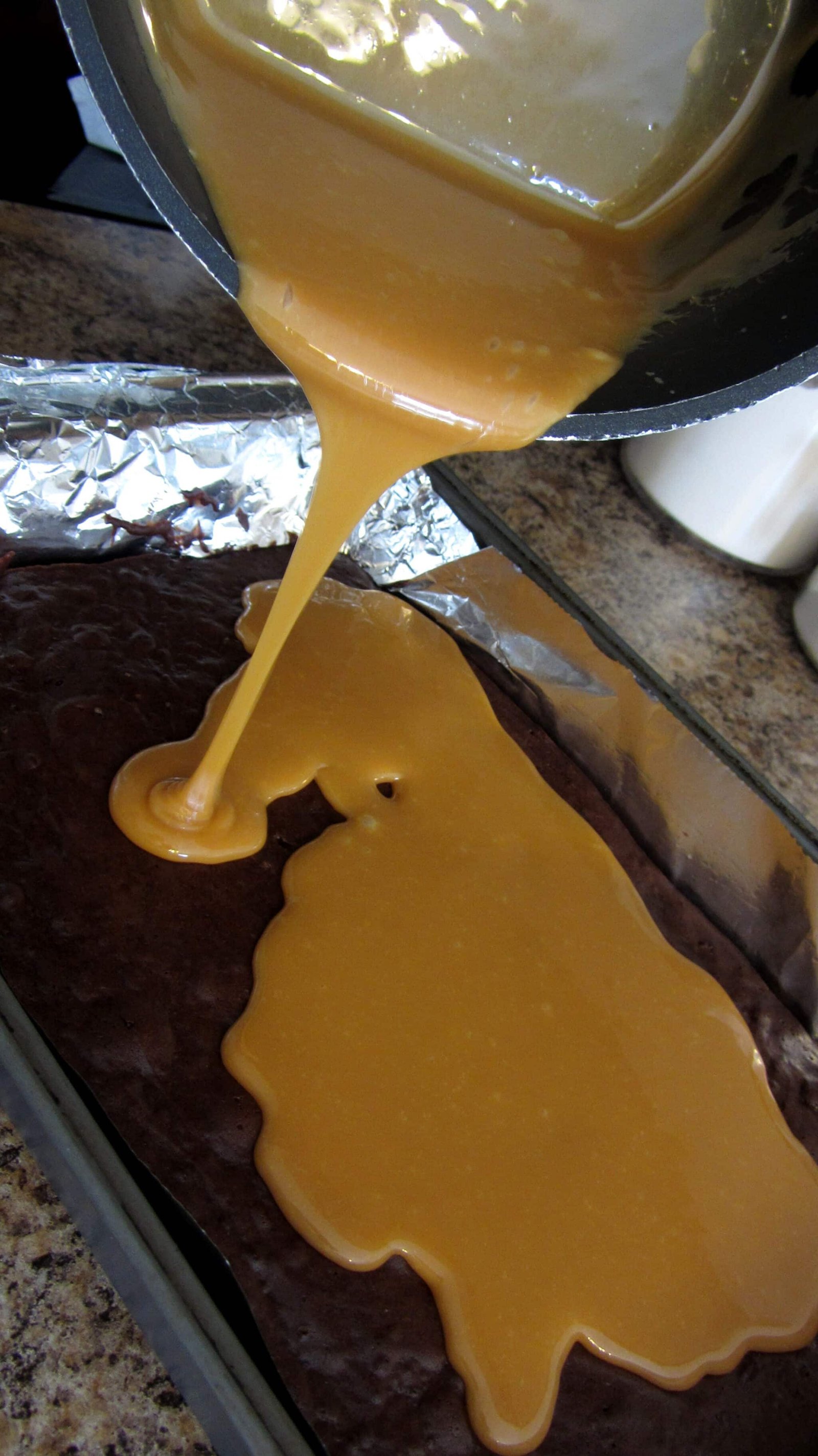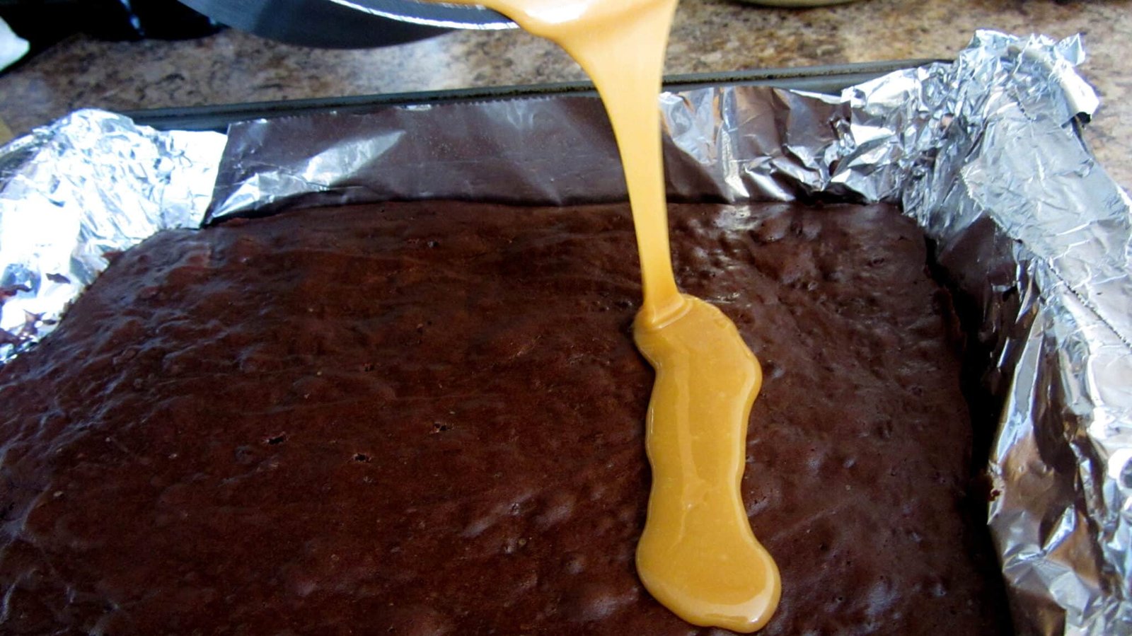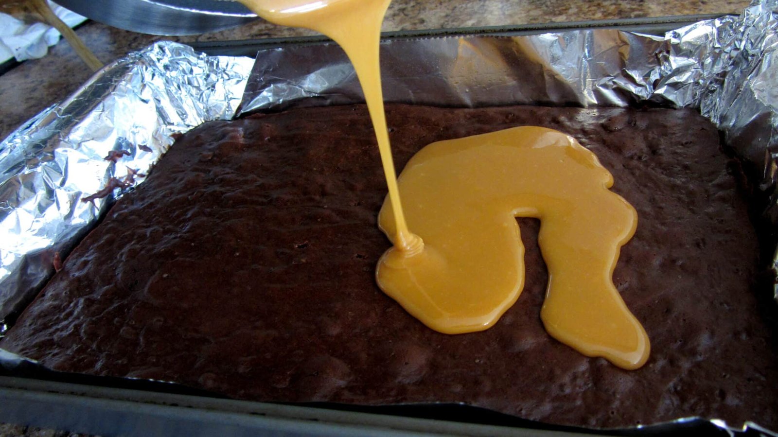 - Once the caramel is poured on the brownie, take the other half of the batter and slowly and carefully pour it on the caramel. The batter got a little stiff on me after sitting there for so long, so I put it in the microwave for 10 seconds and it was fine.