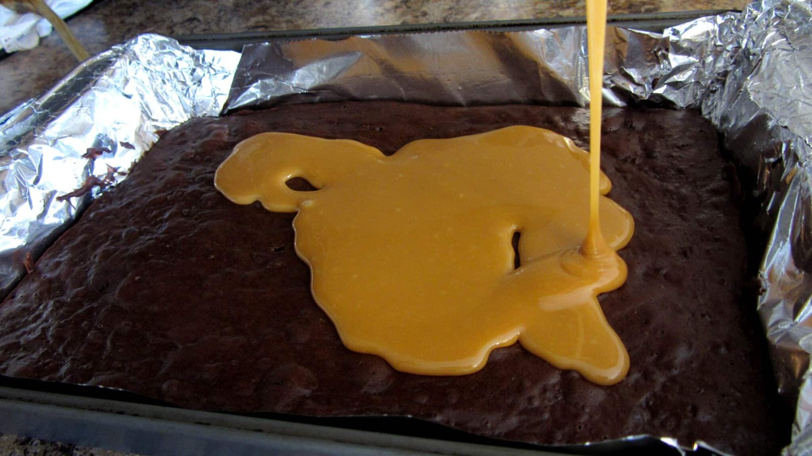 - Do the same you did for the first layer. Once it’s all in the pan, just spread it out until everything is evenly covered. It might be a little more difficult with the caramel there, but if you poured it around enough, it should be easy to just push a little around to the open areas. Again, it’s going to feel like you don’t have enough, but if you were good at splitting the batter in half, then you have nothing to worry about.