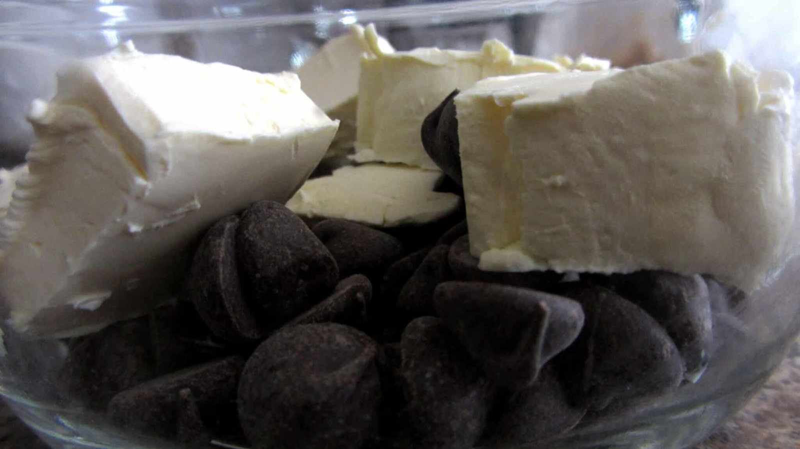 - Dice up the butter and put it on top of the chocolate in a microwave safe bowl. Heat it for 30-45 seconds. If the butter hasn’t melted give it another 10 seconds. Once the butter is melted give it a stir with a whisk until it’s nice and smooth.