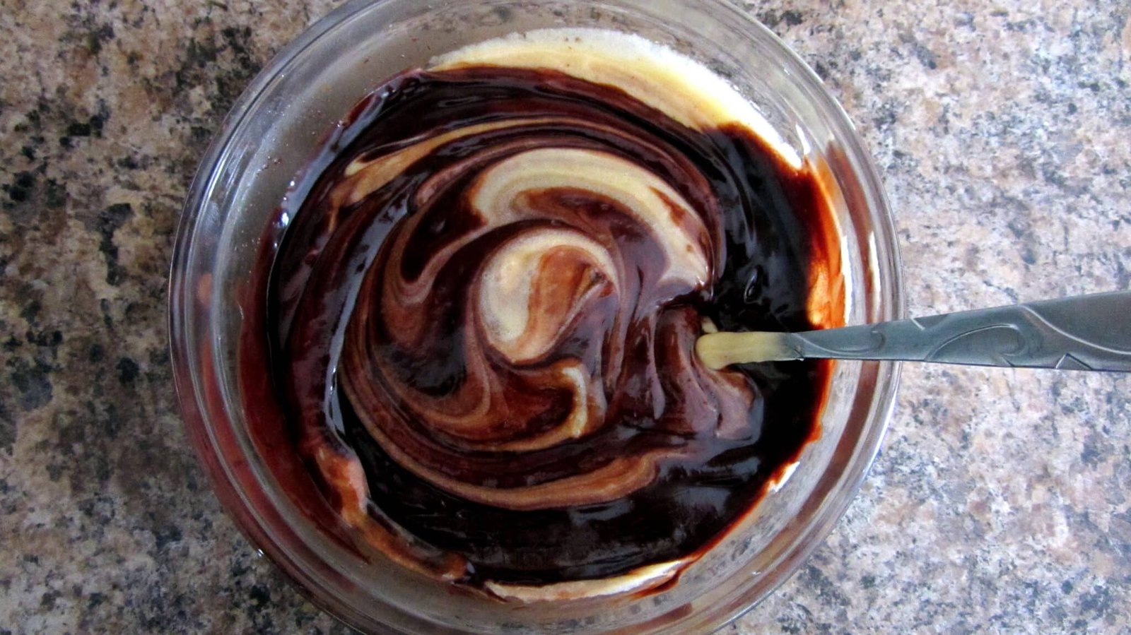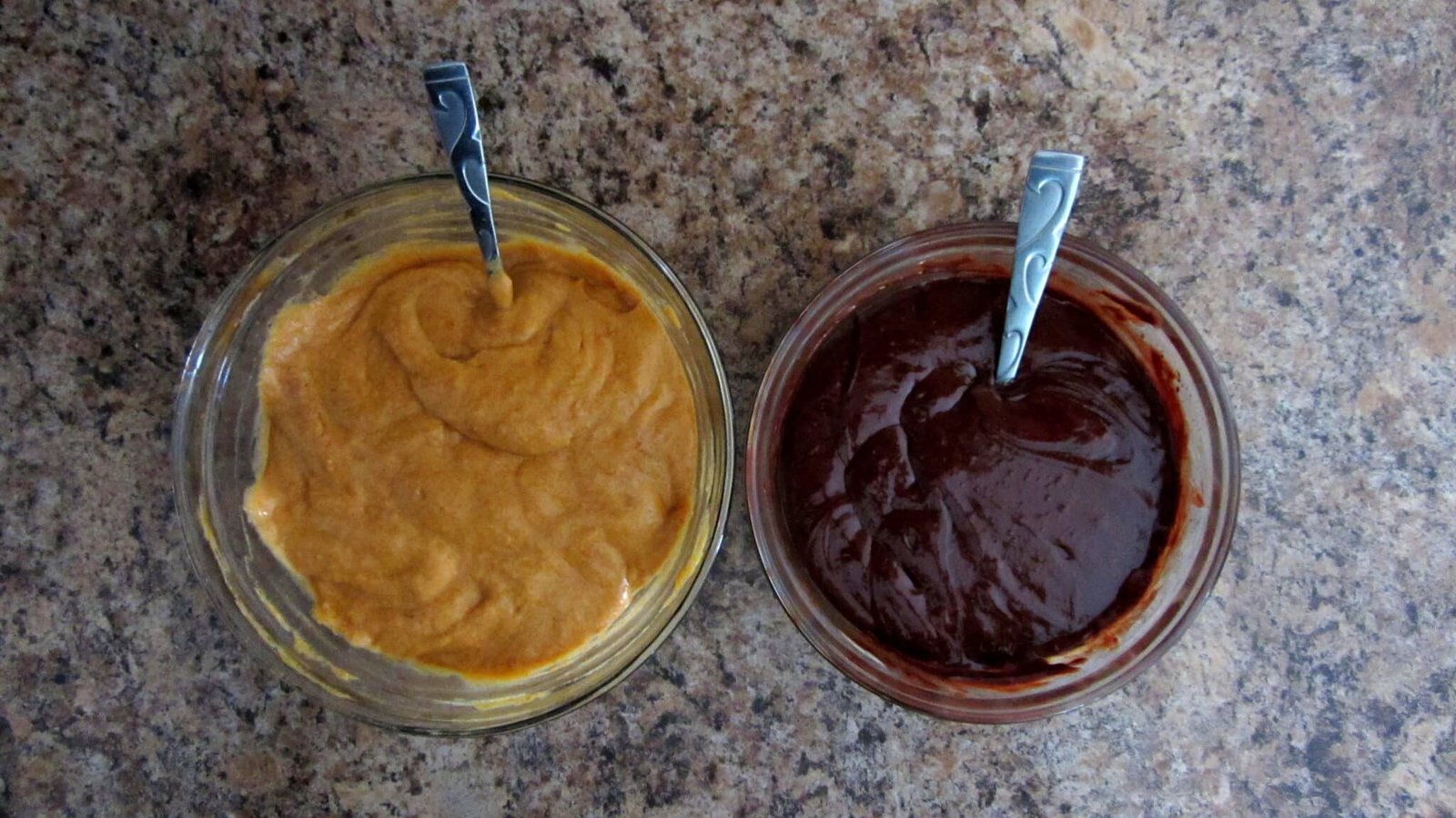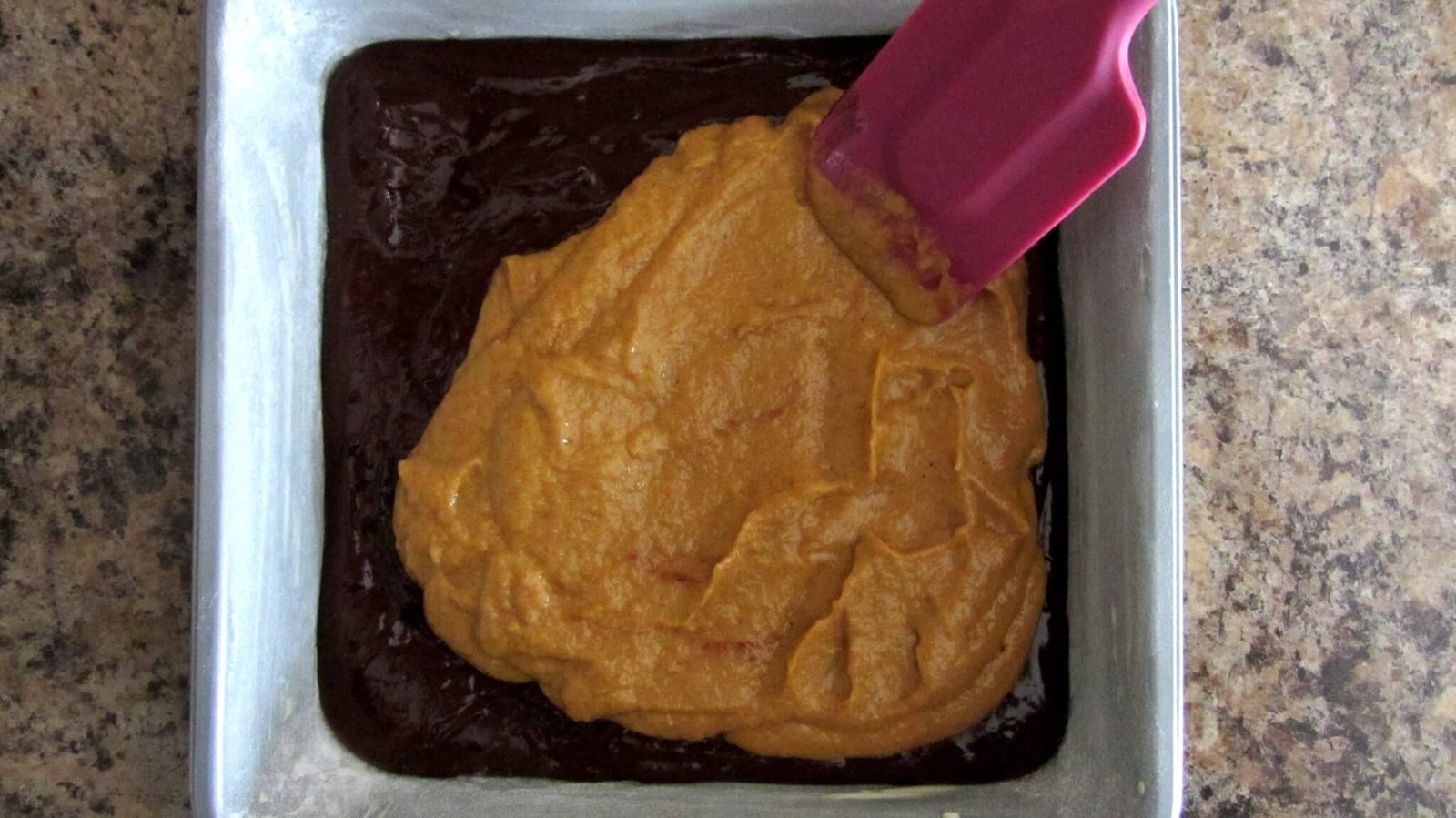 - Take the chocolate mixture and pour half of it into the baking pan. Smooth it out as best you can without leaving any holes. Next, take half of the pumpkin mixture and pour it slowly on top of the chocolate. Smooth it out carefully, try not to mix it together. Repeat with the rest of the chocolate and then the rest of the pumpkin.