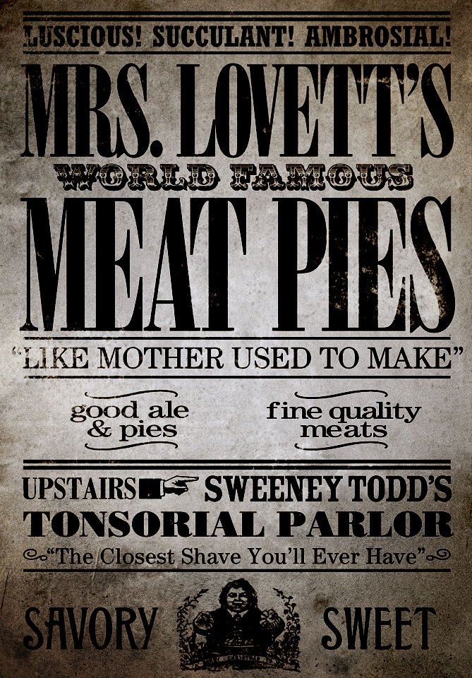 ‘Ello! Honestly I came for the Pirelli’s elixir sign (art project, don’t worry I’m not selling it as my own) but I soon got sucked into reading the page. I’ve been testing different meat pie recipes for a while, trying to find one to complement my Mrs. Lovett cosplay. Looks delicious!