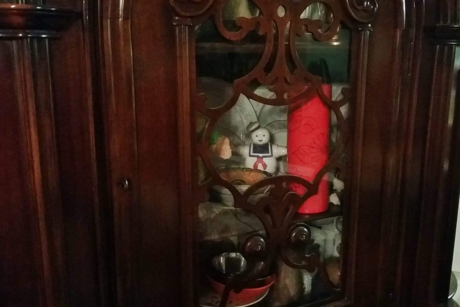 - While at my parents house, I noticed peeping out of their china cabinet like a stray dog at an Italian restaurant window was poor Mr. Stay Puft. During my childhood I always had big birthday parties and my grandmother always made ceramic figures out of whatever was the theme. It was hard for me to resist smuggling him out of there.