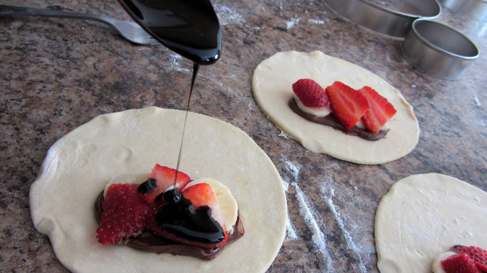 - Spread the nutella in the center of one half of the cut dough. On top of that put a couple of slices of bananas and strawberries, then drizzle some balsamic reduction on everything.