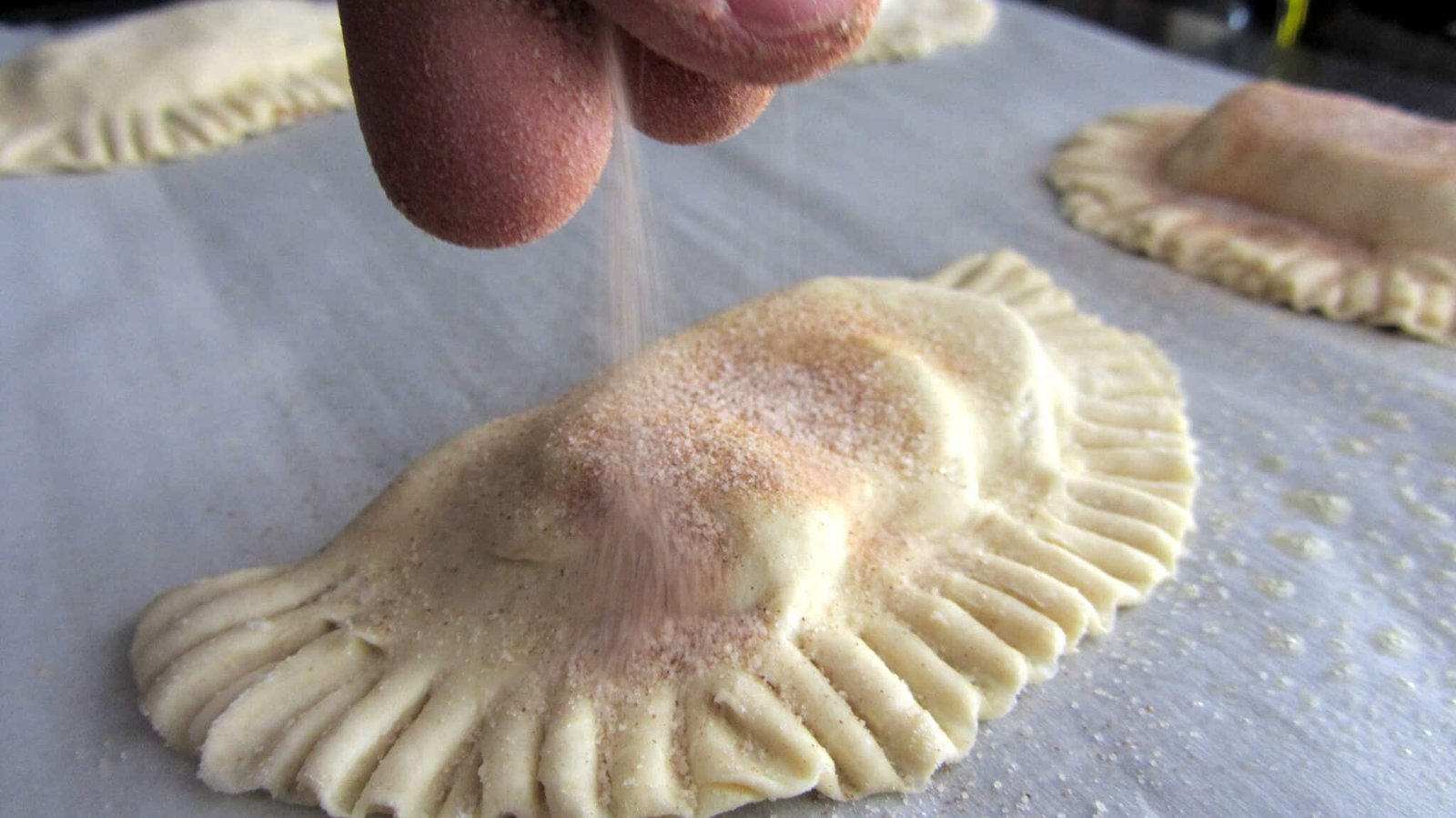 - Put the pies on a parchment lined pan (I always spray my parchment too), and cover with cinnamon sugar. Then take your egg and whip it up with a splash of water and brush it on the pies. That’s where the nice brown shine comes from. Once done, pop in the oven for about 11-14 mins, or until they look tasty.