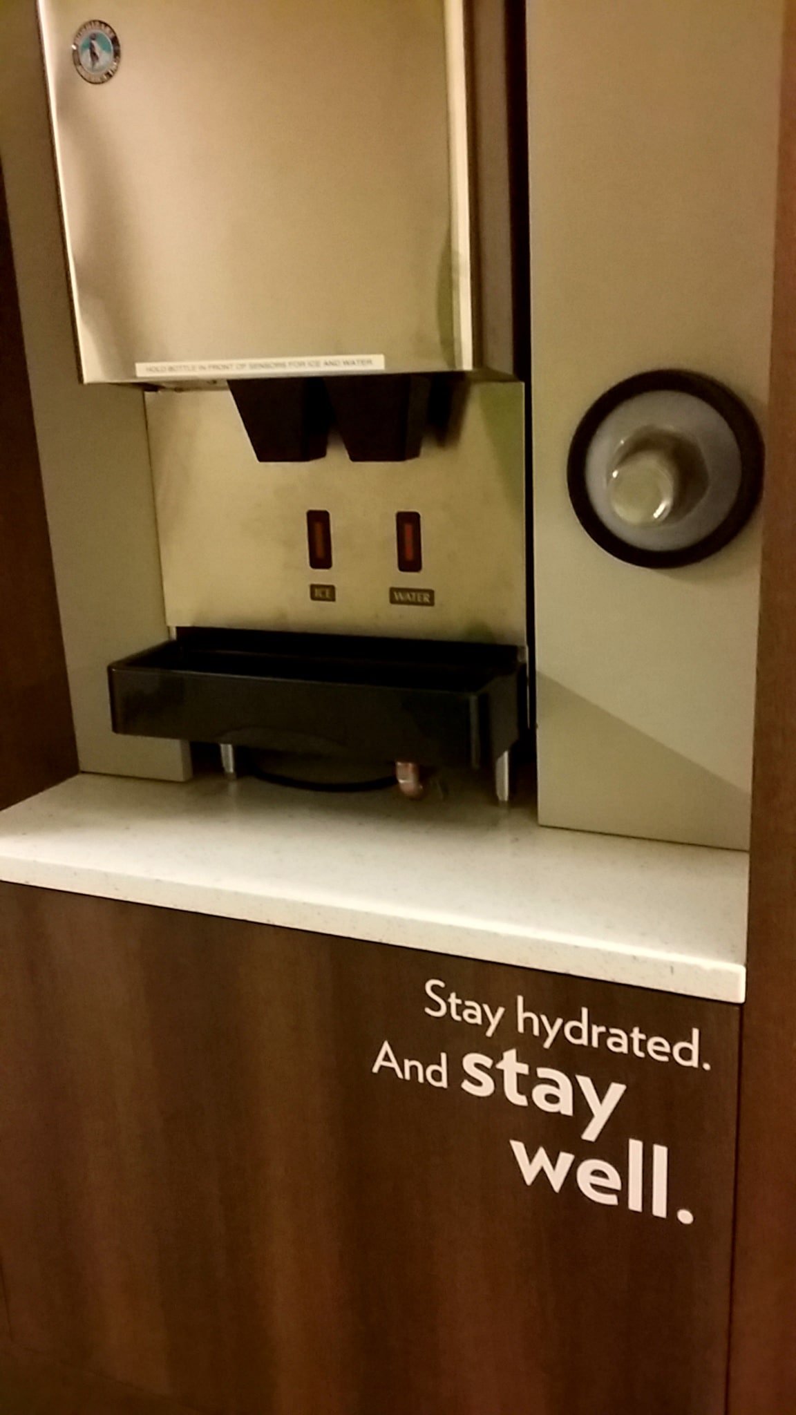 - Anyway, there was an exercise ball along with a yoga mat, and other fitness necessities (necessities?) like stretchy ropes with handles and really big rubber band looking things, all in the room! And we got a free water bottle that we were able to use at the free filtered water dispenser down the hall. Which was pretty damn useful, tell you the truth. These fit people know what they’re doing!
