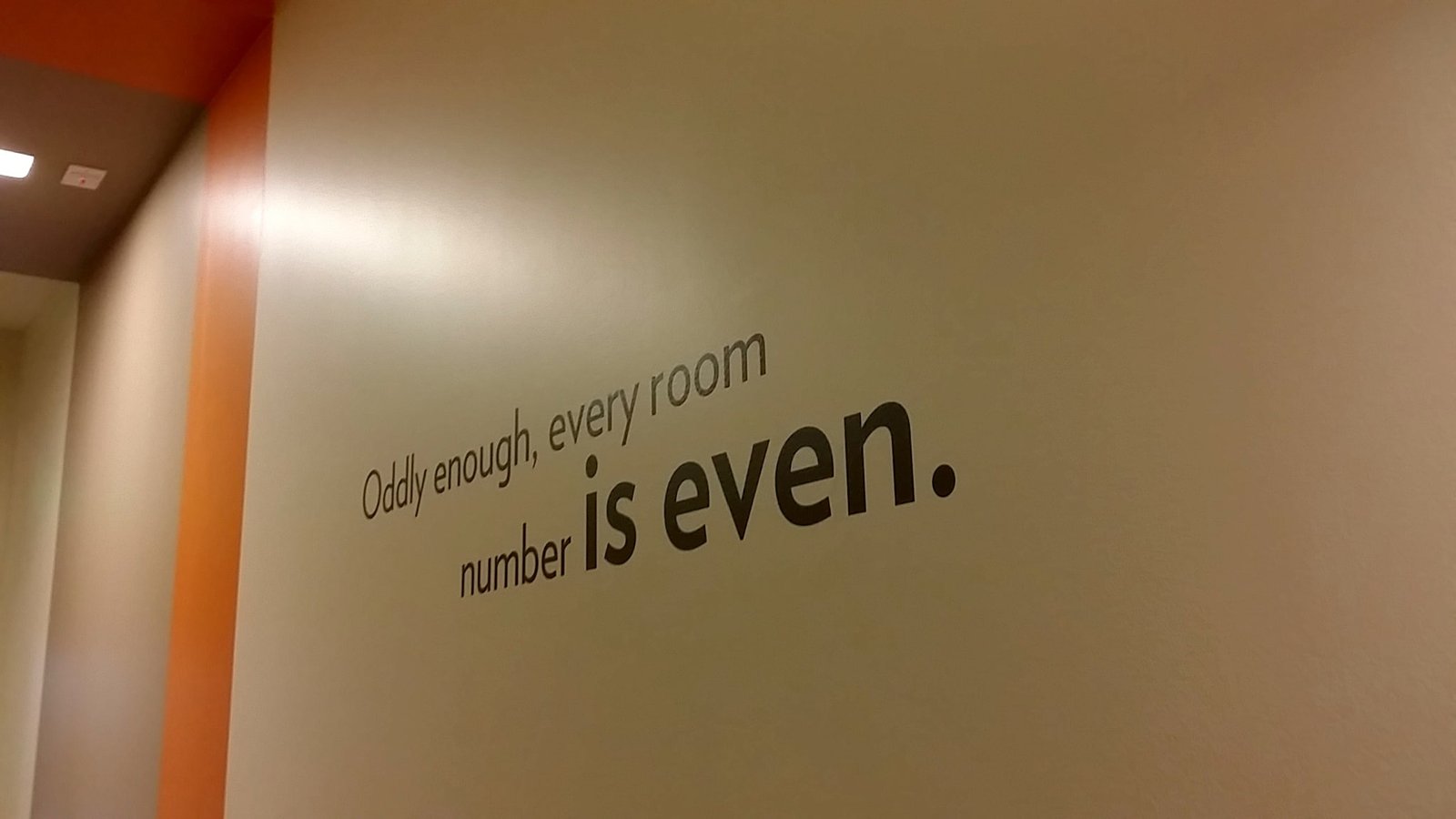 - See the “Oddly enough, every room number is even” coded message thing? I didn’t notice it till I saw that. I told the wife, “hey, every room number is even. Probably some mumbo jumbo to do with yoga and keeping the mind balanced.” Then she said, “…Or maybe it has to do with the hotel’s name being ‘Even’..” I felt like crap. Like I was racist towards fit people or something. I’m sorry fit people, I didn’t mean it! Some of my best friends are in shape…