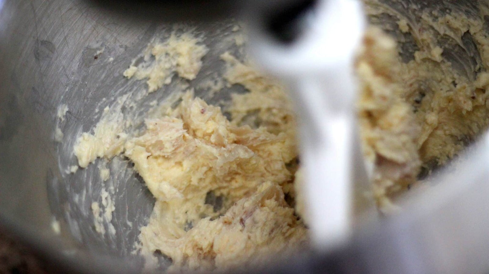 - Then start adding the eggs one at a time as well as the vanilla. Mix together your dry ingredients – flour and baking soda – and incorporate it in about 3 batches. Once you got the dough, pour the most amazing looking bowl I’ve ever seen into it.