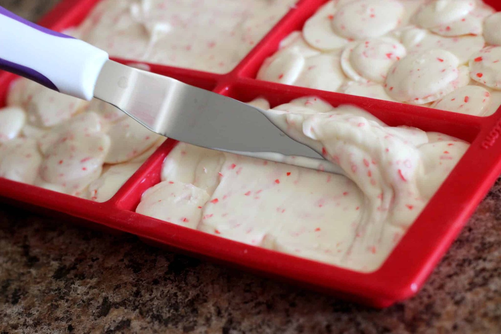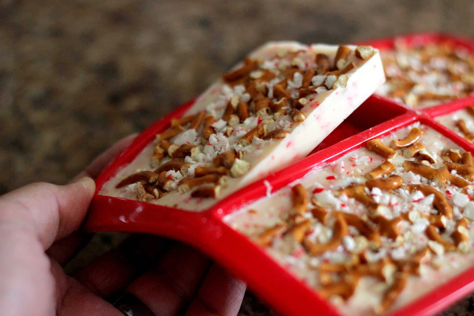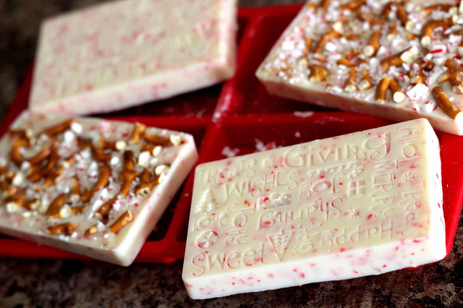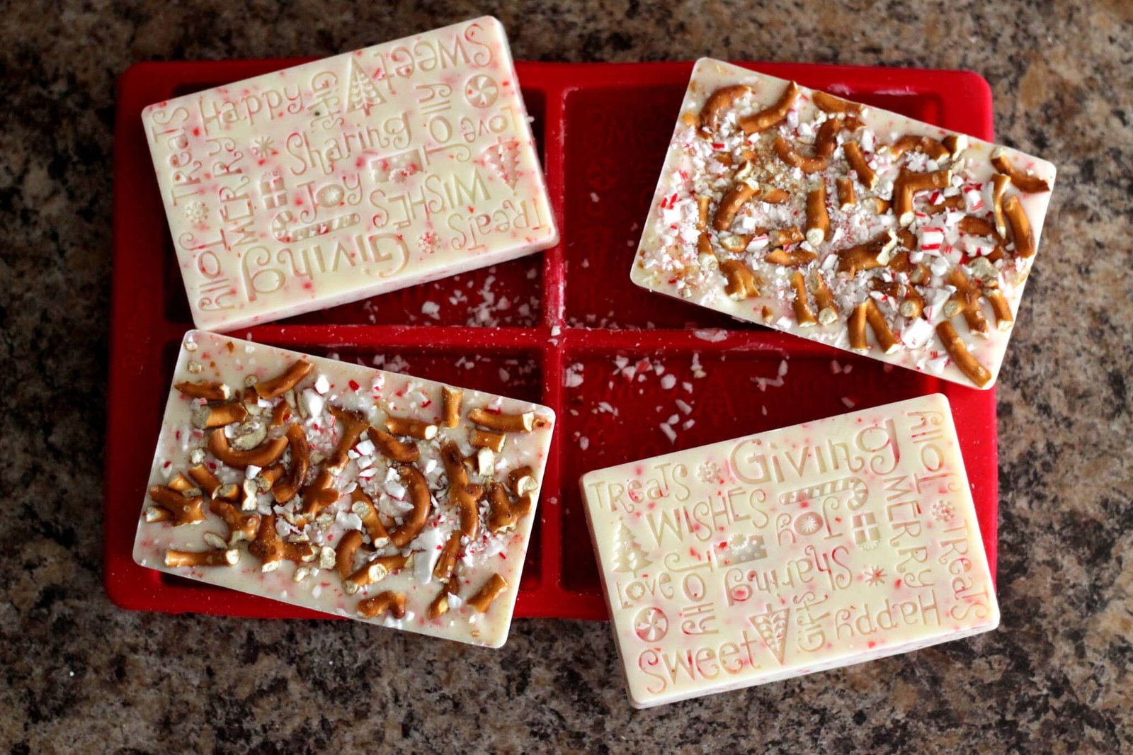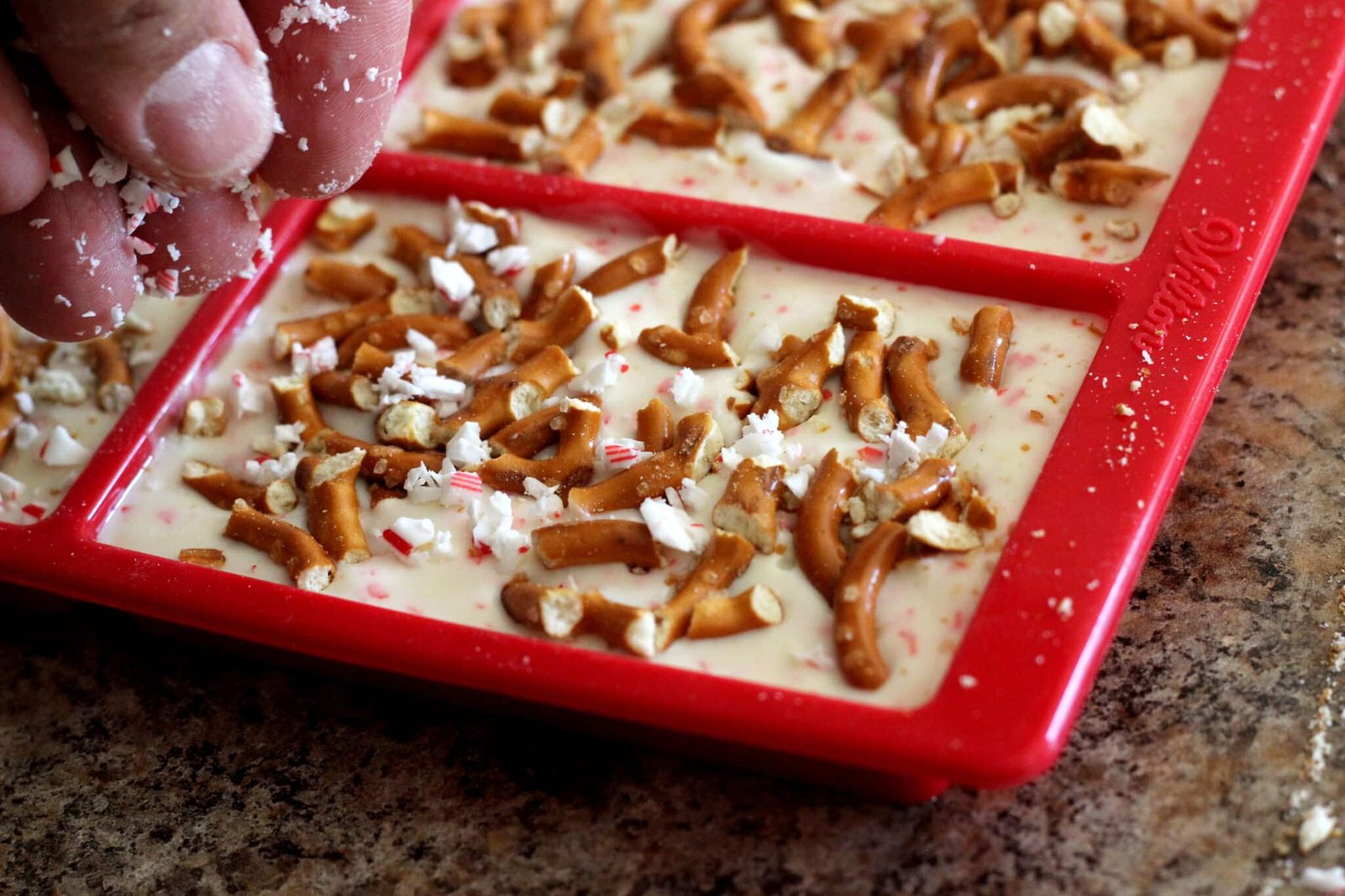 With so many possibilities you can make with this mold, I chose this one because of an old experience. I remember a few years ago, we were in a store after Christmas and were doing what everyone else does in stores after Christmas – walking down the clearance aisle. There, we found white chocolate covered pretzels with sprinkled candy cane bits. Intrigued, we tried them out and obviously missed the label on the bag that advertised they were laced with crack. We just couldn’t stop eating them and wanted to buy more but it was the last one! Ever since then, the combination has really stood out for me.