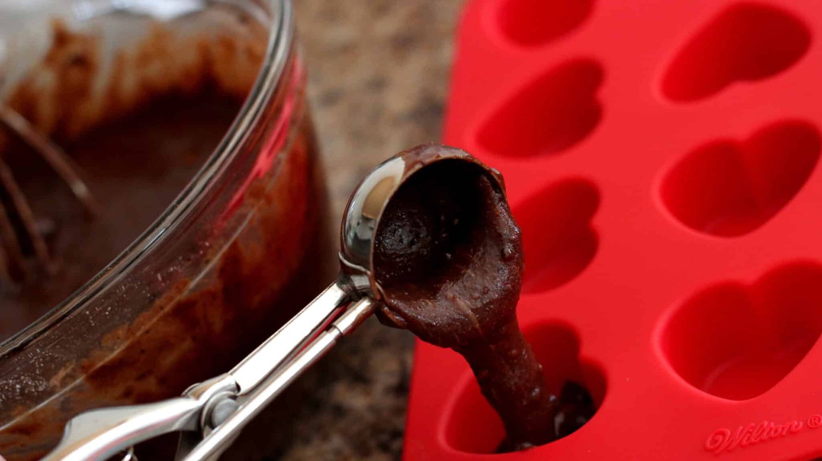 - Give the mold a little spray with non-stick. Take a spoon or whatever it is you like to use and pour the batter into the hearts. You’re looking to fill them halfway, so don’t go crazy.