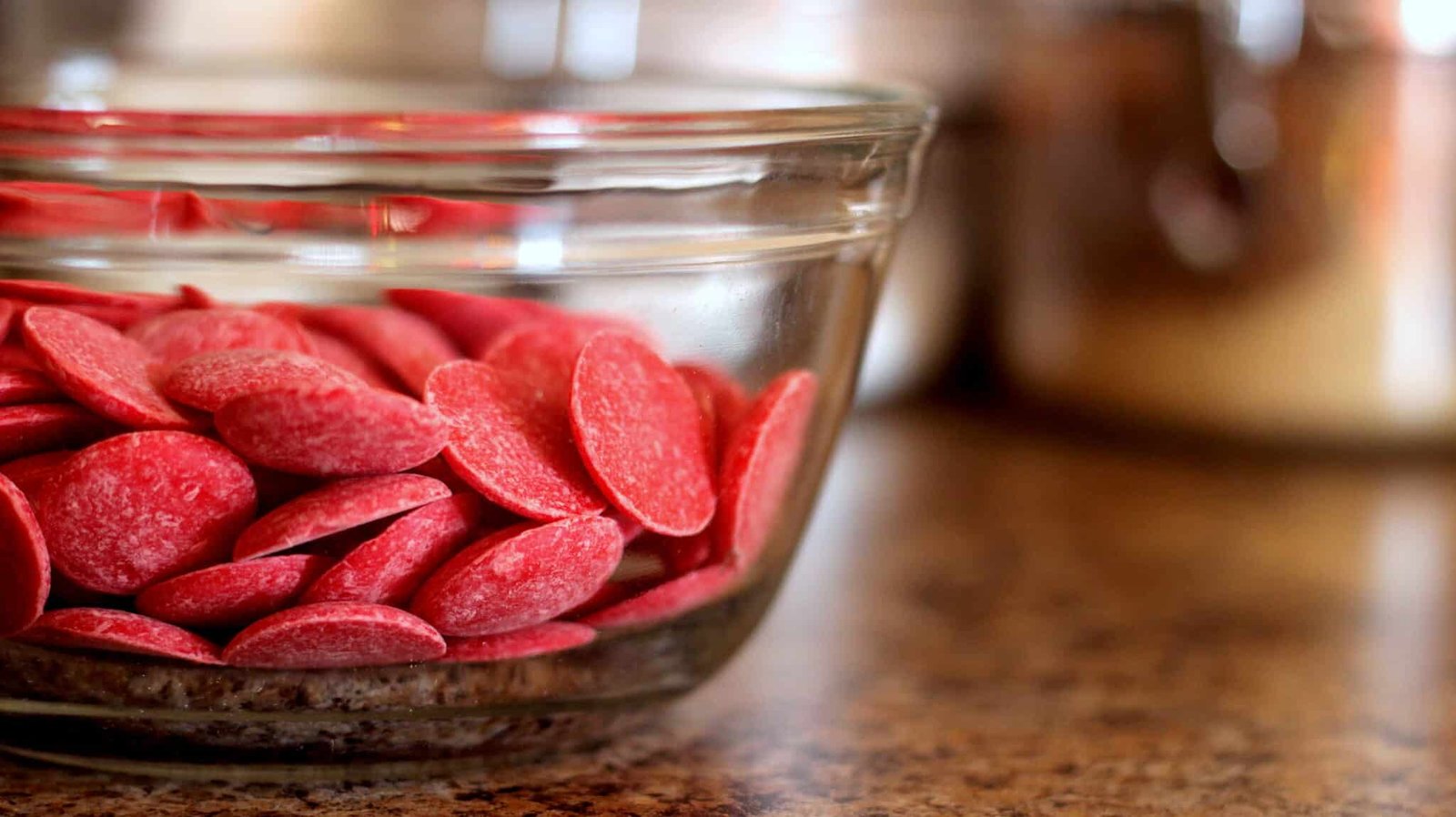 - Put the whole bag of red candy melts in a microwave safe bowl. Microwave for 1 minute at 50% power, then take out and stir, and repeat until they’re melted.
