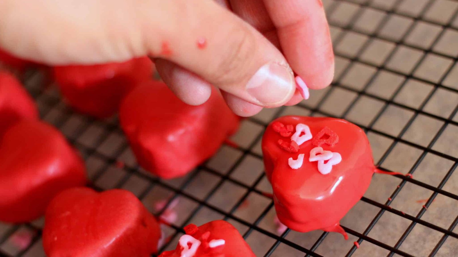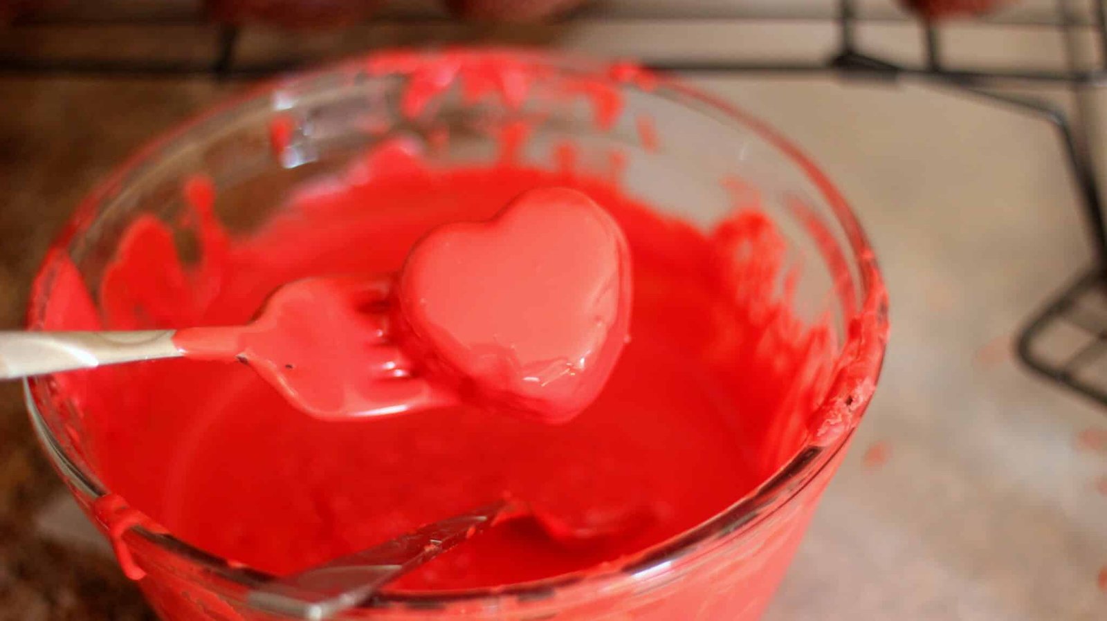 - This is where it gets fun! Drop a heart in the melted pool of goodness and get it nice and coated. Get your favorite fork (come on, everyone has a favorite fork) and fish it out. You want to pick it up from the bottom and then tap the fork on the side of the bowl a few times to get the excess off. Transfer it over to the cooling rack using a second fork, picking it up from the bottom.