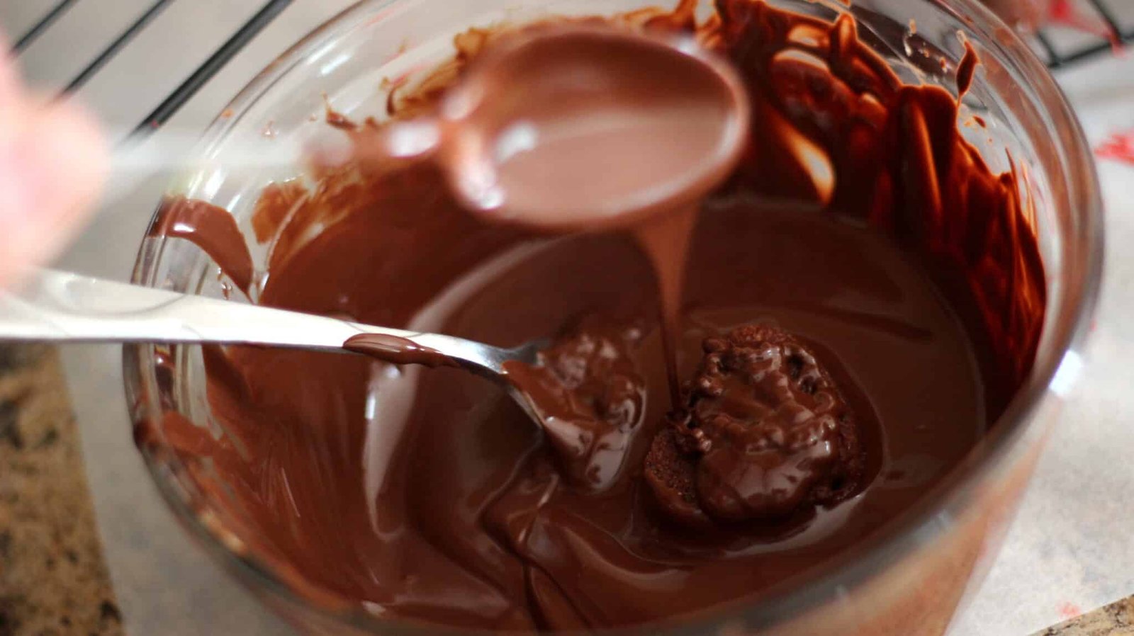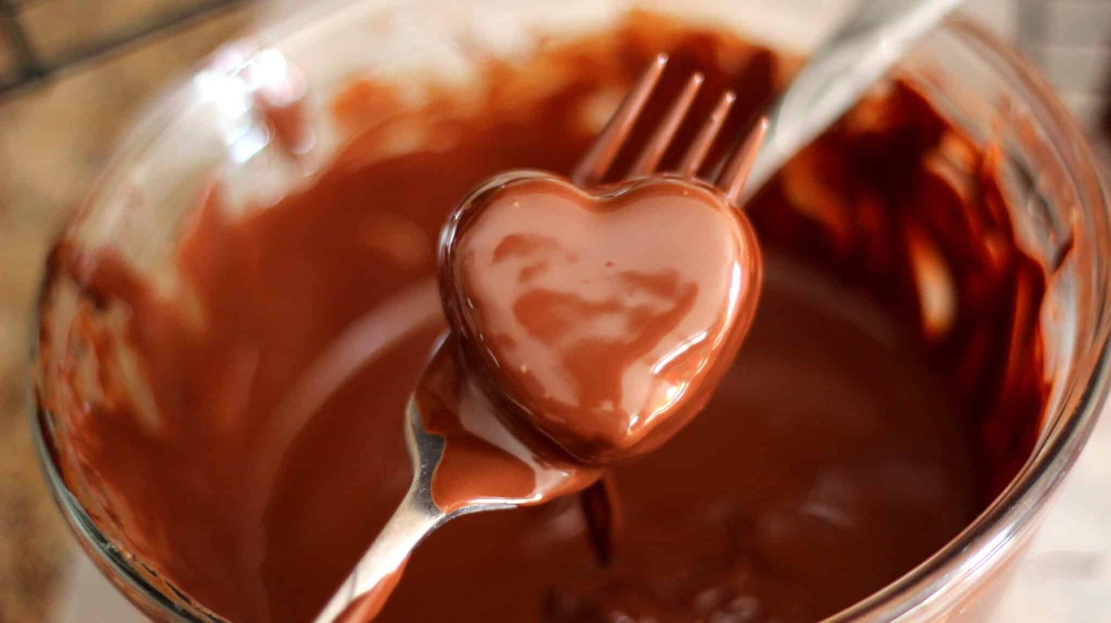 - This is where it gets fun! Drop a heart in the melted pool of goodness and get it nice and coated. Get your favorite fork (come on, everyone has a favorite fork) and fish it out. You want to pick it up from the bottom and then tap the fork on the side of the bowl a few times to get the excess off.