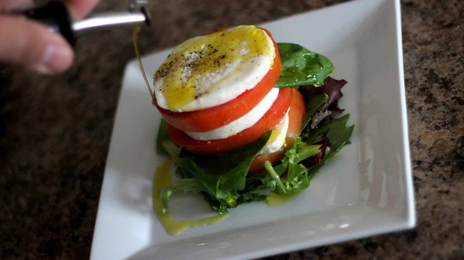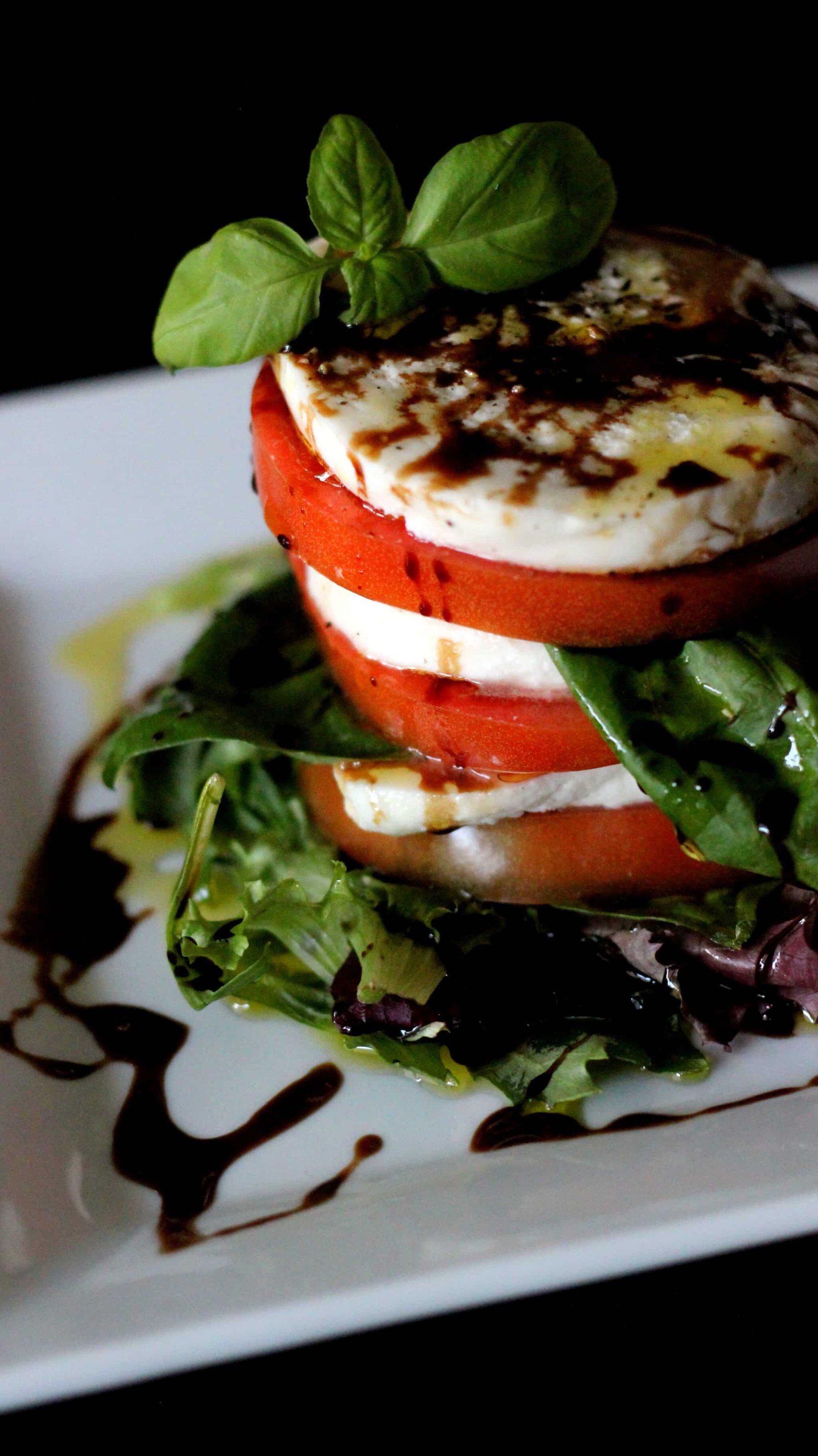 - At this point, depending on the condition of your reduction, you should be ready to plate. So go ahead and get a small bed of mixed greens on a plate. On top of that, put a tomato, then some cheese, and a basil leaf. Repeat in the same order till the tower is 6 high – 3 tomato and 3 cheese.