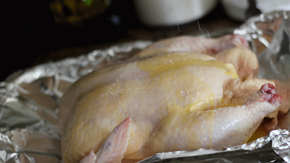 - First thing is getting the chicken done. Turn the oven to 450 and the bird ready for its fate. Get it nice and buttered up, and sprinkle plenty of salt on it. I usually truss my chicken but for this I just let it roast free. I think it gives it more of a medieval look. Once it’s ready, pop it in the oven for about an hour.