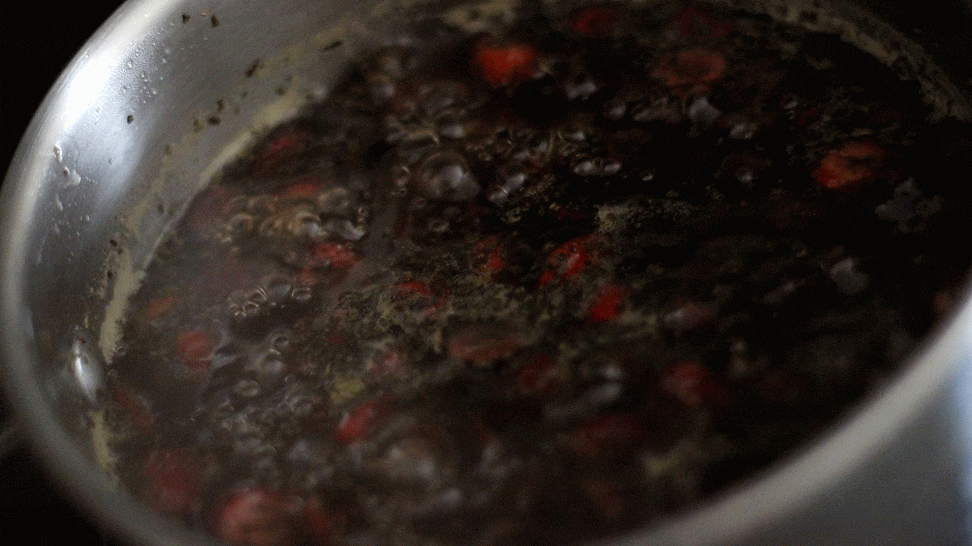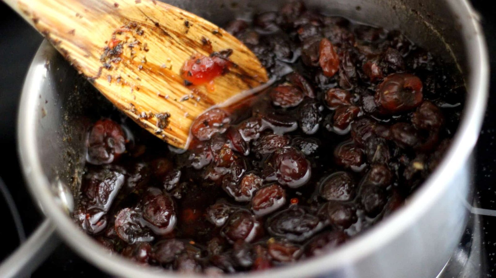 When it’s reduced enough and you take it off the heat, you’ll see the nice plump fruit and thick sauce just begging to be poured on some chicken.