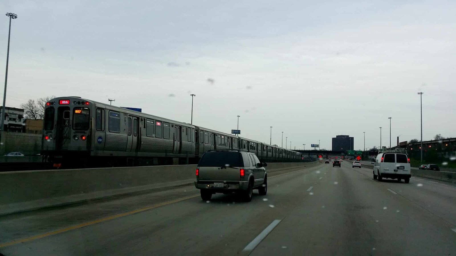 At this point I was making plans in my head to leave a little later in order to pick up a hot dog for the road and some pizza to bring home. But sadly, we had to leave in the morning. Early in the morning. And that we did. We were on the road at about 7:30am and this time we knew time travel was going to work against us. If it was any earlier, seeing this train in the middle of the highway would’ve freaked the hell out of me.