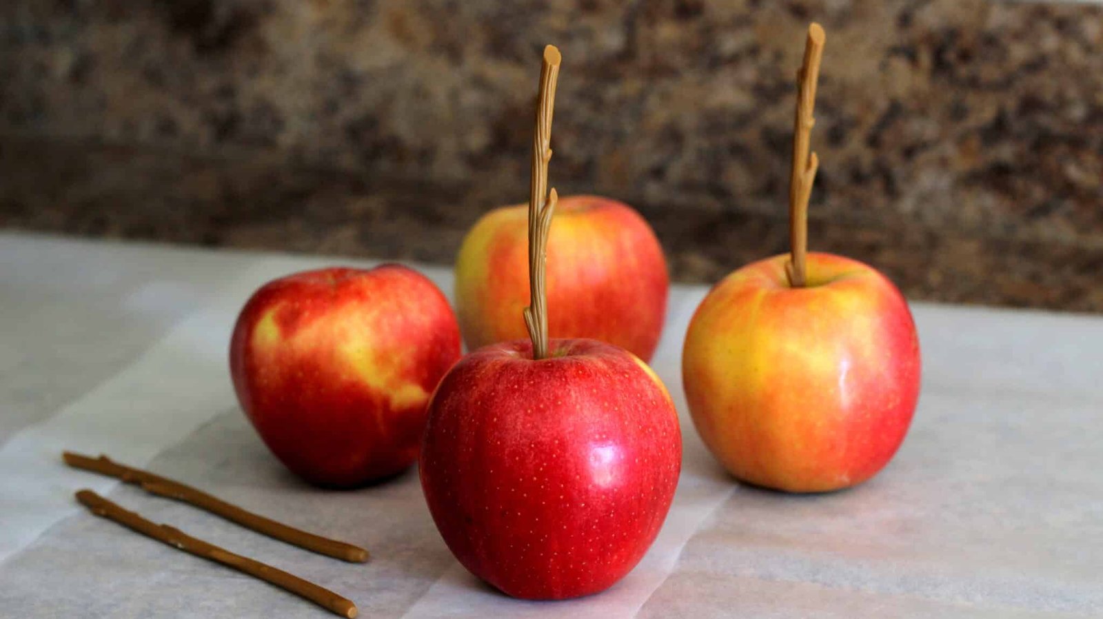 - Then you want to prep your apples with the sticks. Now, I’m not going to lie to you, these sticks are freaking adorable. I kid you not, my desire to make caramel apples was born solely from the desire to use these sticks. They look so awesome and rustic and natural, it’s an absolute necessity when making caramel apples. So be sure to pick them up!