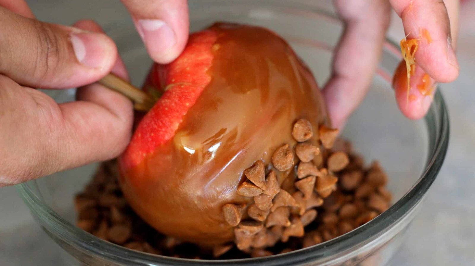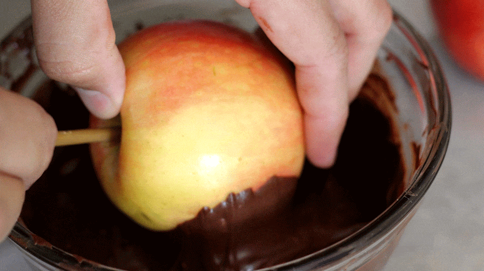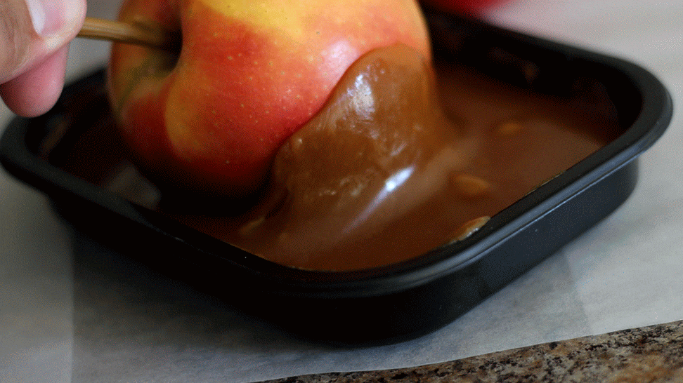 - The trick is to roll the apple through the dip. You’ll get a nice coating through the whole thing and it’ll be even for the most part. Put one hand on the stick and guide the apple with your fingers on the bottom. You might get some caramel on your hands but c’mon, I’m sure you’ve gotten messy with worse things. I guess you could’ve used a fork or something but where’s the fun in that?
