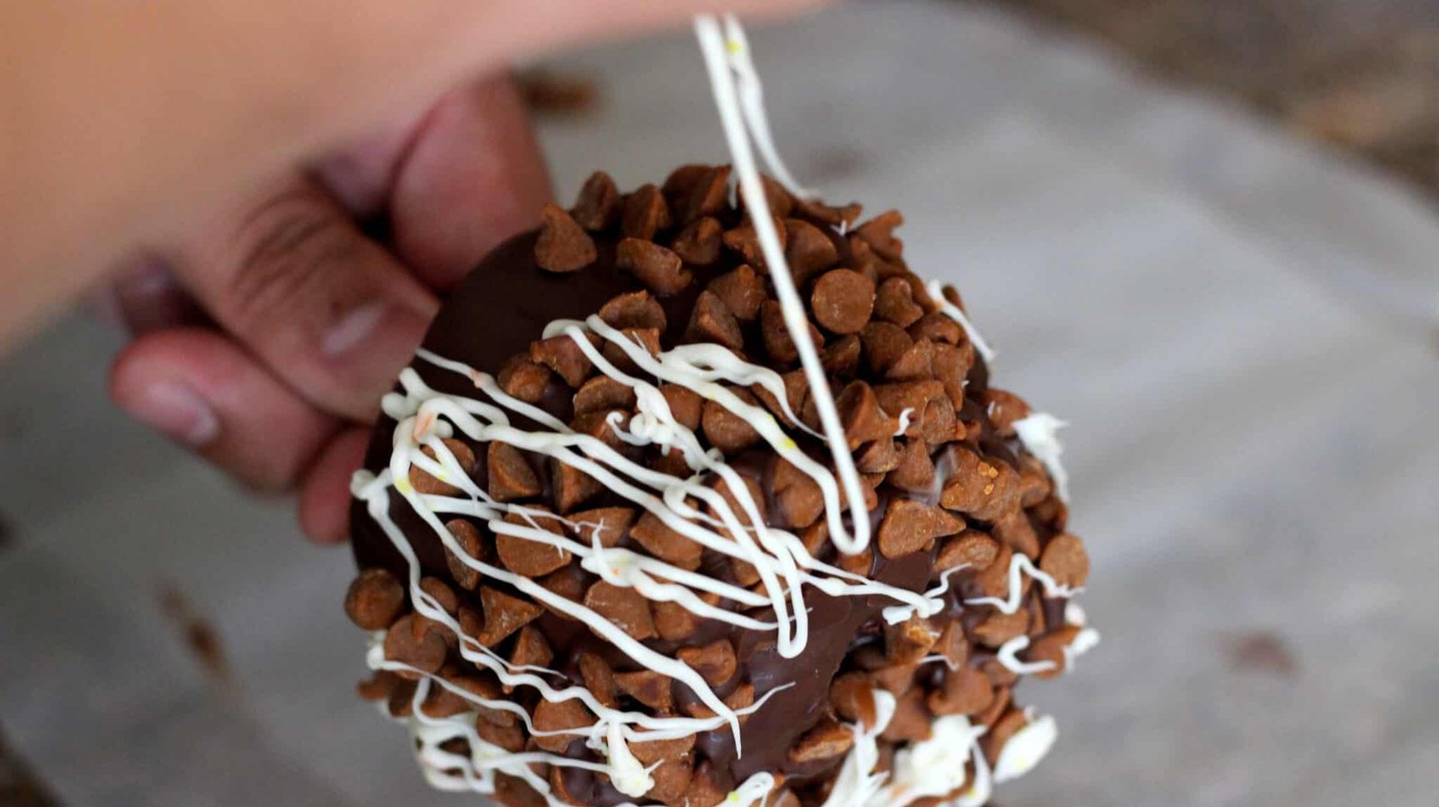 - So just turn the apples about while you’re drizzling the chocolate or candy melts from the bag. Oh my gosh, the horror in the difficulty!