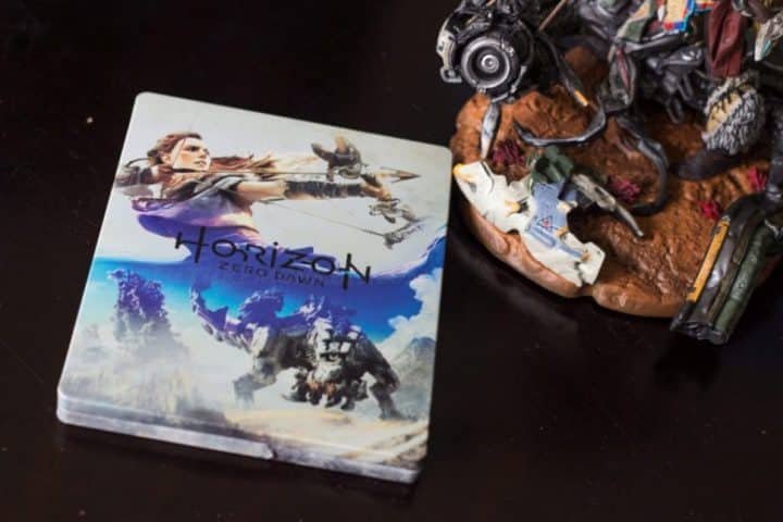 First and foremost, the game itself in a snazzy steelbook. And next to it, the standard sized art book that you usually find in these CE’s. Lemme tell ya, I’m a simple man. A steelbook and an art book is all I need to be happy in a Limited Edition. I guess I’m just low maintenance, I don’t know. I mean, if you’re loving a game, and appreciating the art and how amazing it all looks, an art book is perfect to compliment it, right? Yeah, that’s what I thought. I’m hoping to one day get The Art of Horizon Zero Dawn because I feel like I’ll be able to sit with that for a few hours. And with how much the kid is into watching the game, I’m sure he’ll love it too.