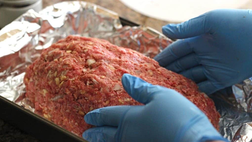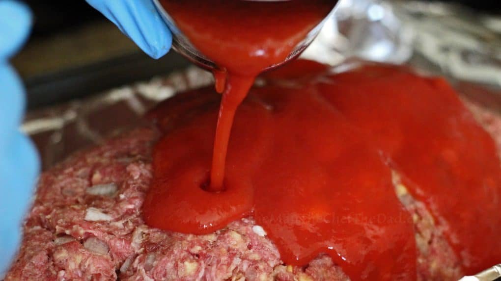 - Form a loaf with the mixture in the pan, then pour tomato sauce over it, covering the whole loaf.