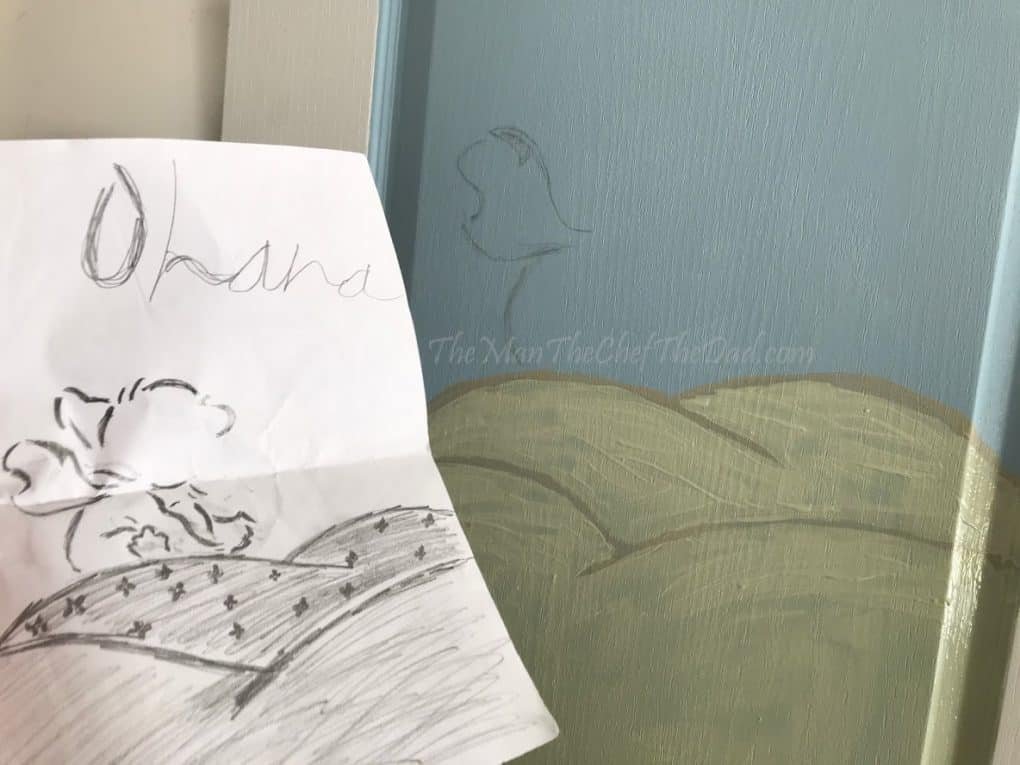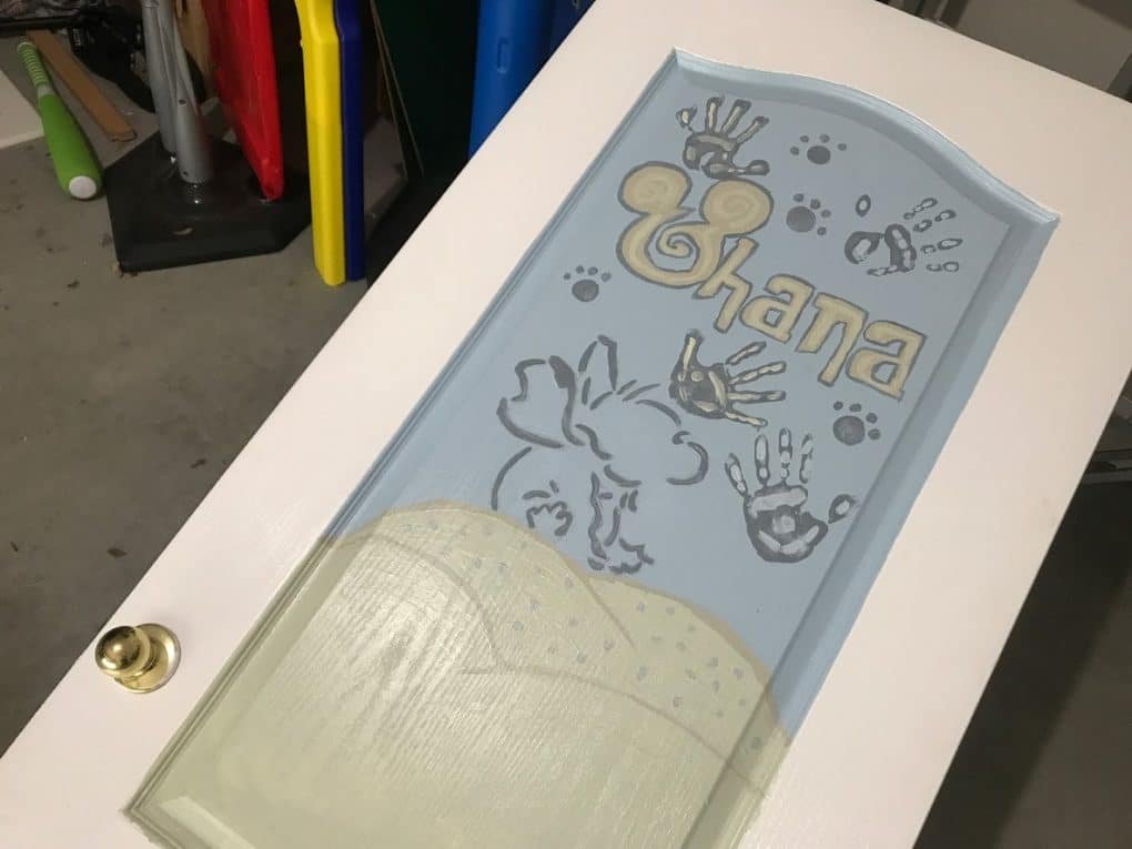 I had this planned out since before the summer. A surprise that I wanted to have ready for Mother’s Day, but time and the kids getting out of school really set me back. I did it on a spare door we had in the garage so it was easy to hide from the wife. A rough sketch was made and I painted the blue part before the summer started. Everything else I was able to knock out in one day after the kids went back to school. I never ever ever considered myself an artist by any means and still don’t. But I’m proud of my work here and think I did ok. If I had to do it again I’d only change a few things. Like less butts.
