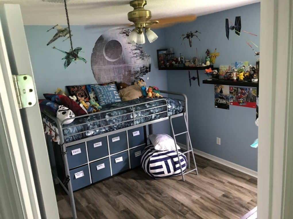 For the youngest, this is his first room (not pictured because not done yet), so there was no adjusting. The oldest had bigger rooms in the houses we were in before, so space wasn’t a problem. We love this house but man is space a problem now in their rooms. But you know what? Not anymore! Careful planning, trying to figure what the best layout could be, it all lead to this. It’s like, omg, look son… You have a floor!
