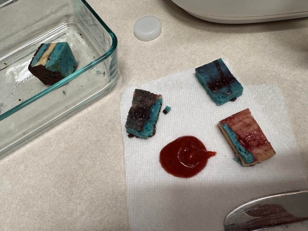 - This year though he refused to let me make him his breakfast! Could you believe the nerve?! So instead, i took the last of his birthday cake (he wanted Italian tri color cookies) and i scraped off the jelly in between the layers and replaced it with ketchup. I figured his brother was old enough to start getting pranked so they both got a ketchup filled cookie. And as it turns out… Ketchup, I guess, is not as different as raspberry jam! Neither of them really tasted it! The boy did a little. But the teen shoved his mouth and didn’t think twice until he saw us laughing at him. So I’d say this April Fool’s was a wash!