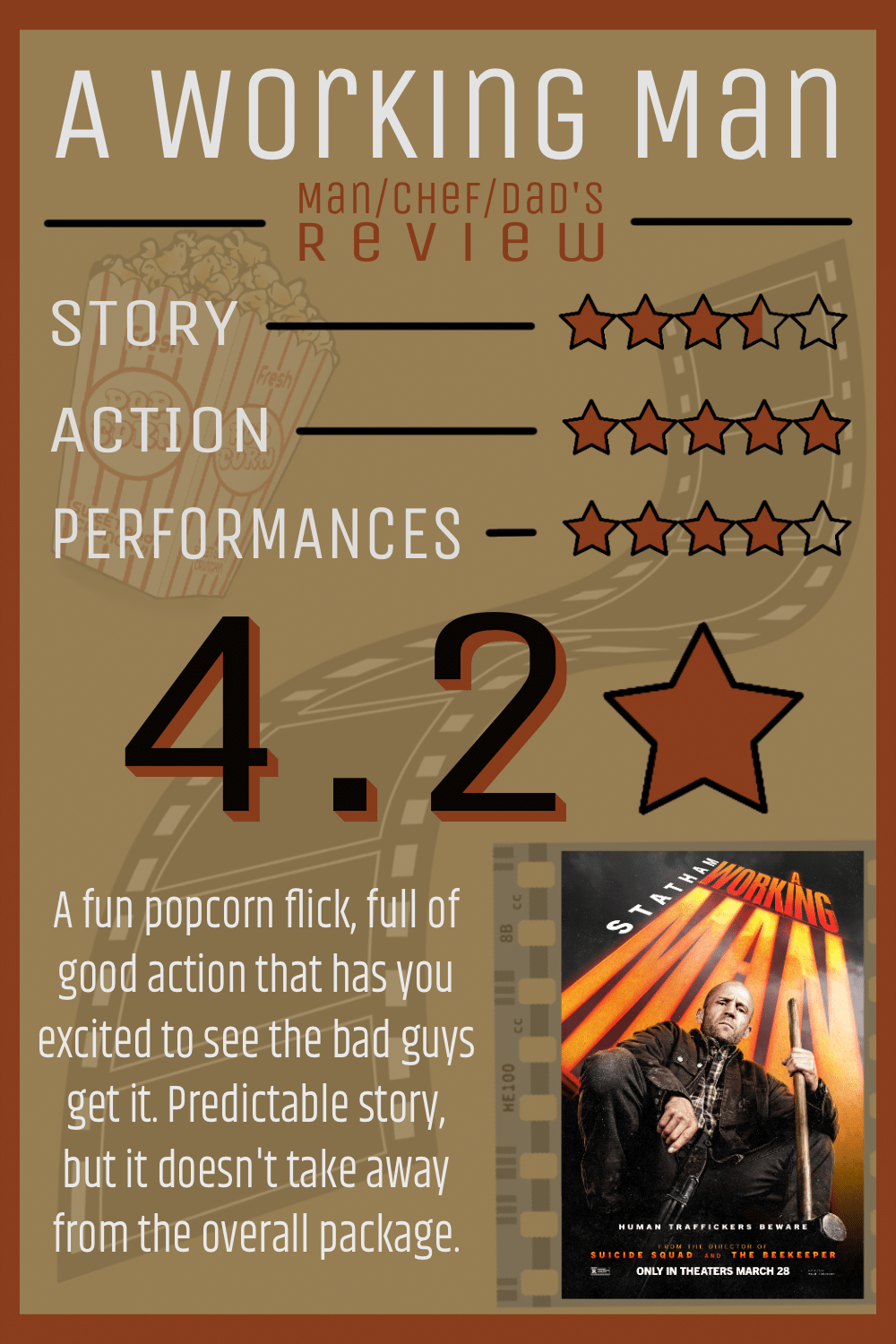 A Working Man definitely checked all the boxes for me. I was into the story and what was going on from the get go. For me, it’s the very definition of a popcorn flick. You get caught up in what’s happening to the characters, things start happening that make you say “awww snap, he’s gonna be mad now!” And sure enough, it starts to hit the fan. And when it does, you’re happy to get splattered with it because you want to see the bad guys get what they have coming. And boy, do they get it!